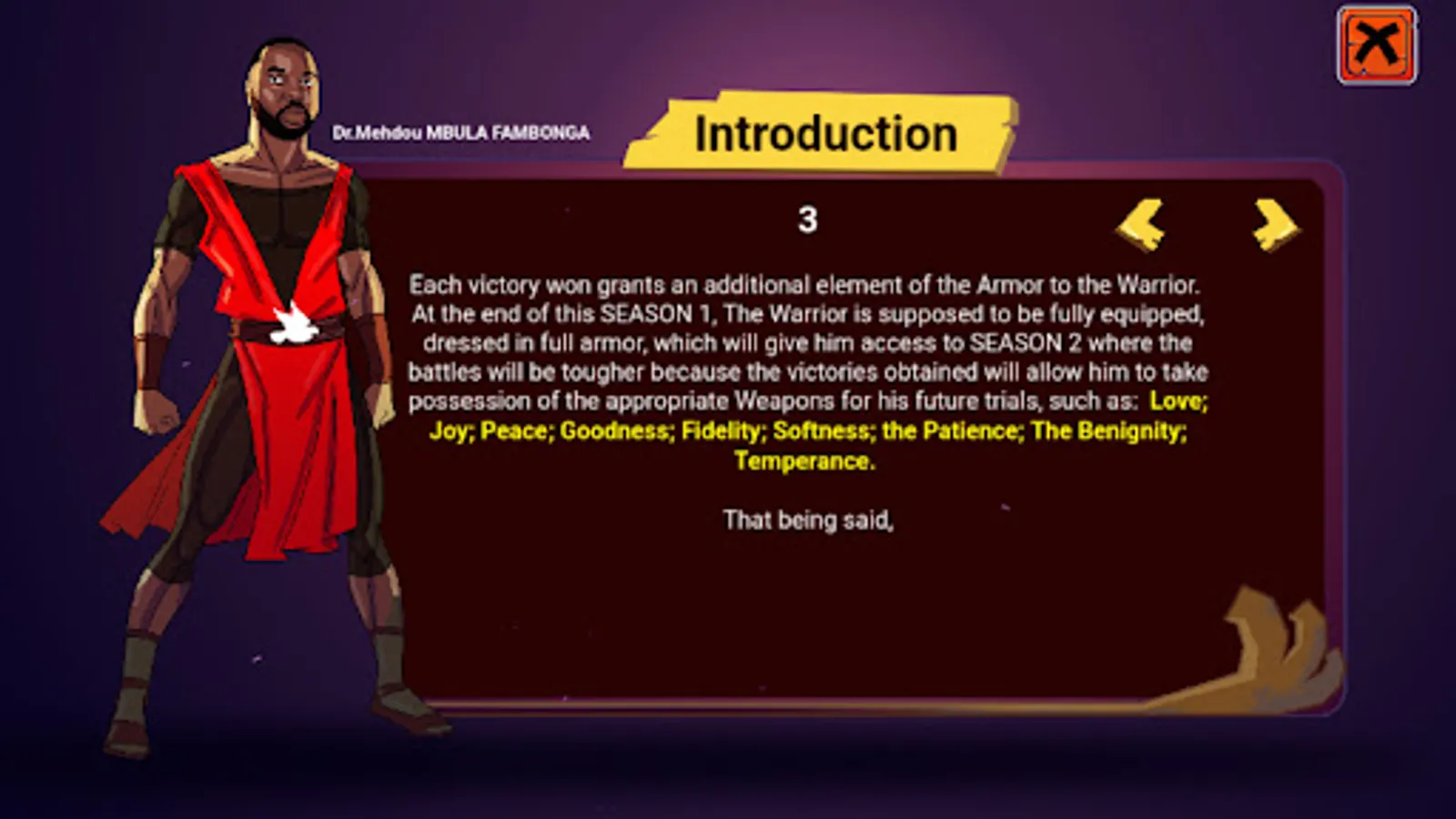 A l'issue de cette SAISON 1, Le Guerrier est censé être entièrement équipé, vêtu d'une armure intégrale, ce qui lui donnera accès à la SAISON 2 où les combats seront plus rudes car les victoires obtenues lui permettront de prendre possession des Armes adéquates. pour ses épreuves futures, telles que : l'amour ; Joie; Paix; Bonté; Fidélité; Douceur; La Patience; La bénignité ; Tempérance