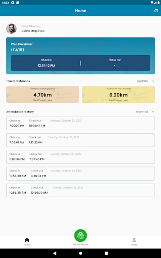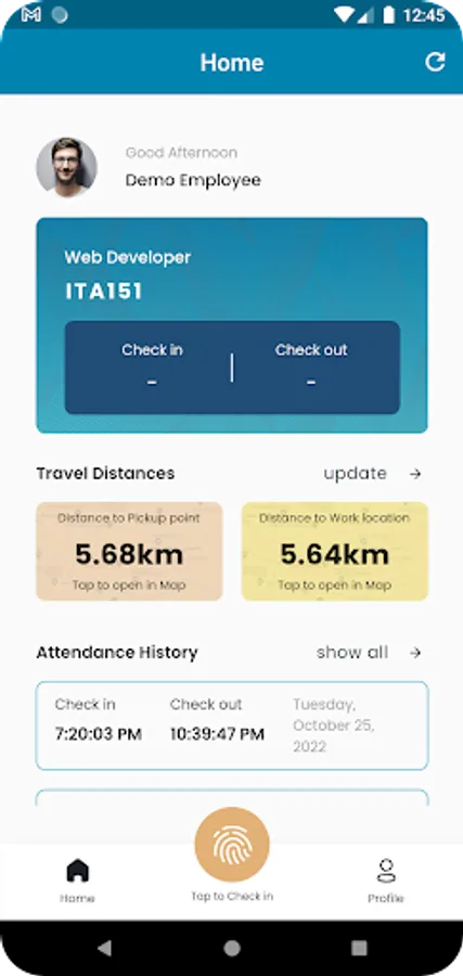The app is intended to be used by staffs of Inspire Talent Acquisition & HR Consultancy to mark their daily attendance and view their presence history. The App also displays the distance between their current location and the transportation pickup point as well as their office location, so that the staff may choose to travel by their own or choose transportation.