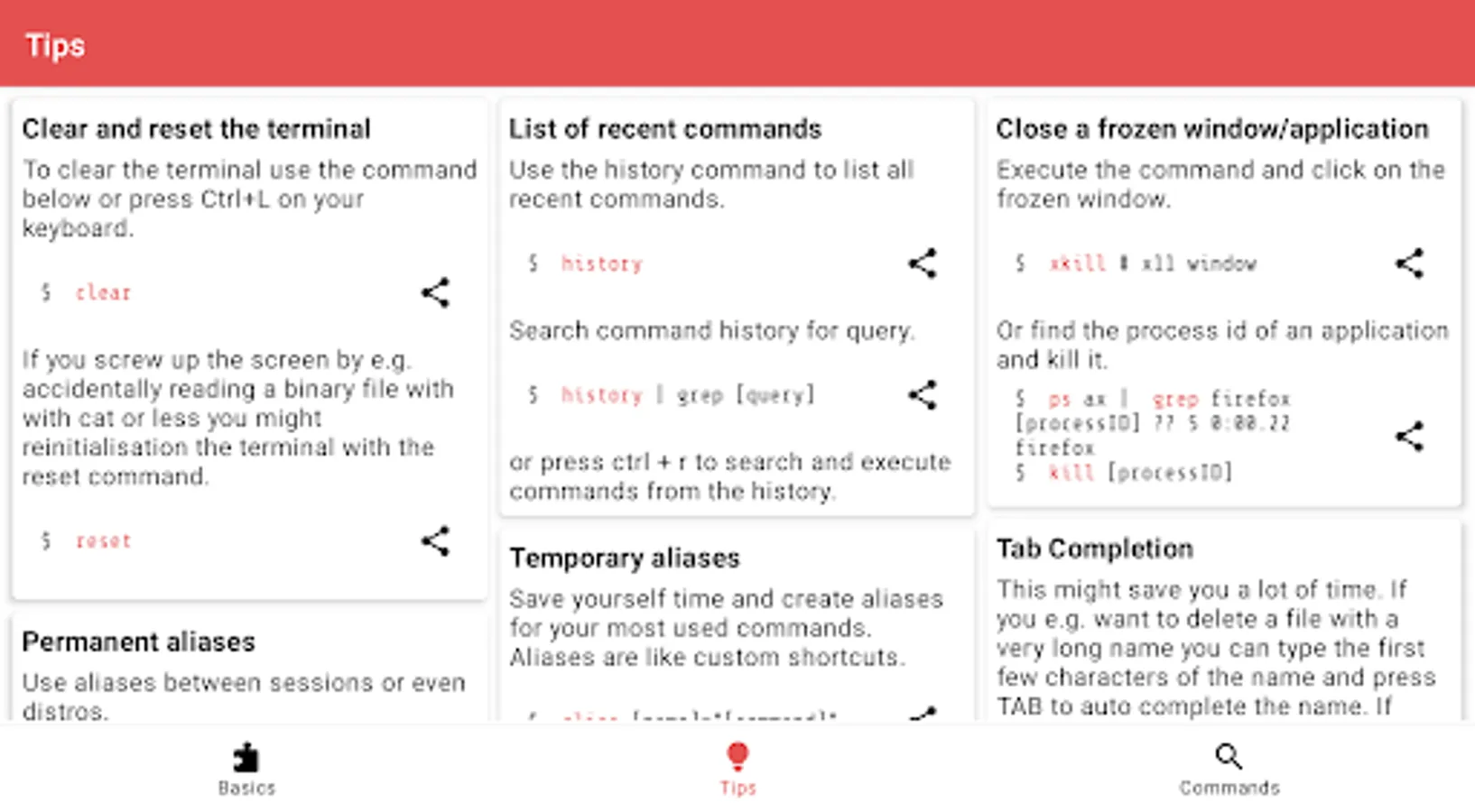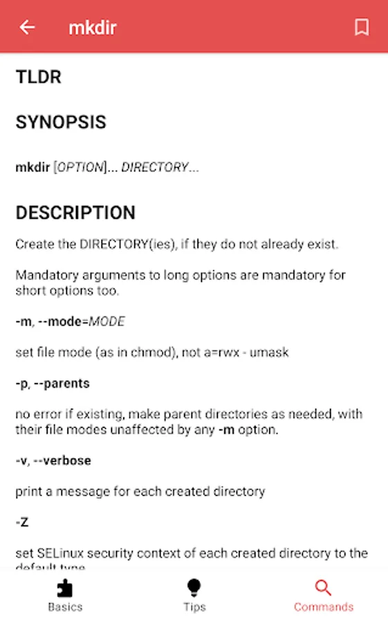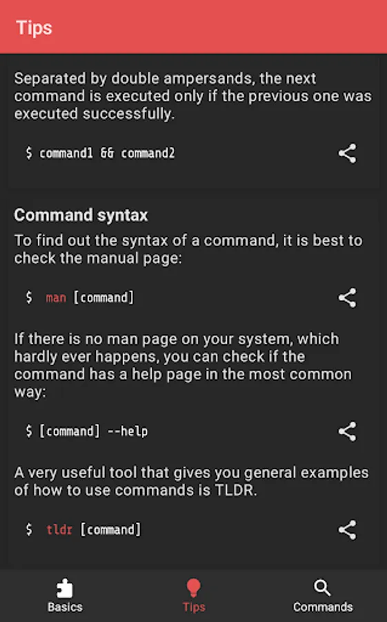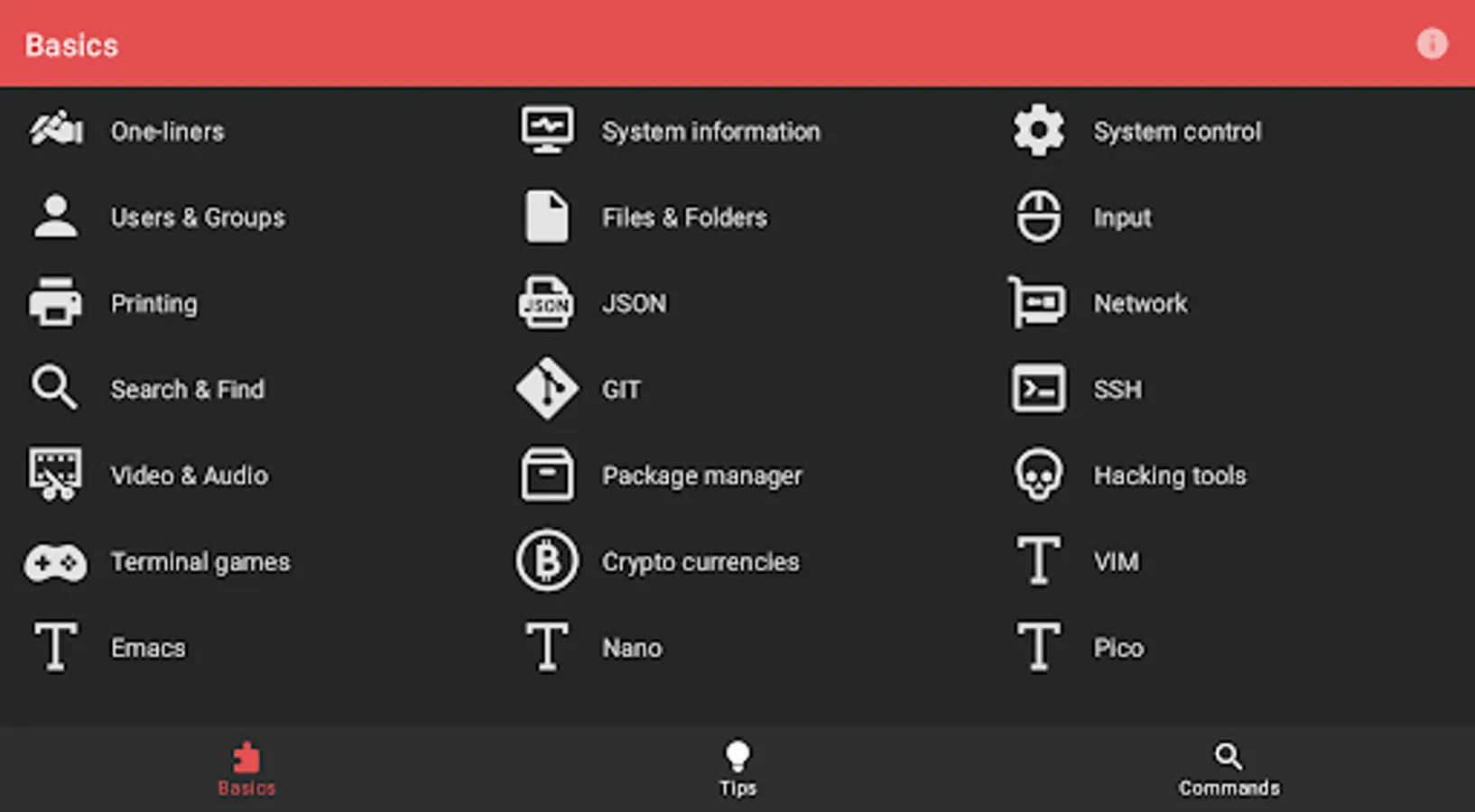 The app currently has 4608 manual pages, 21 basic categories and a bunch of general terminal tips. It works 100% offline, doesn't need an internet connection and has no tracking software.