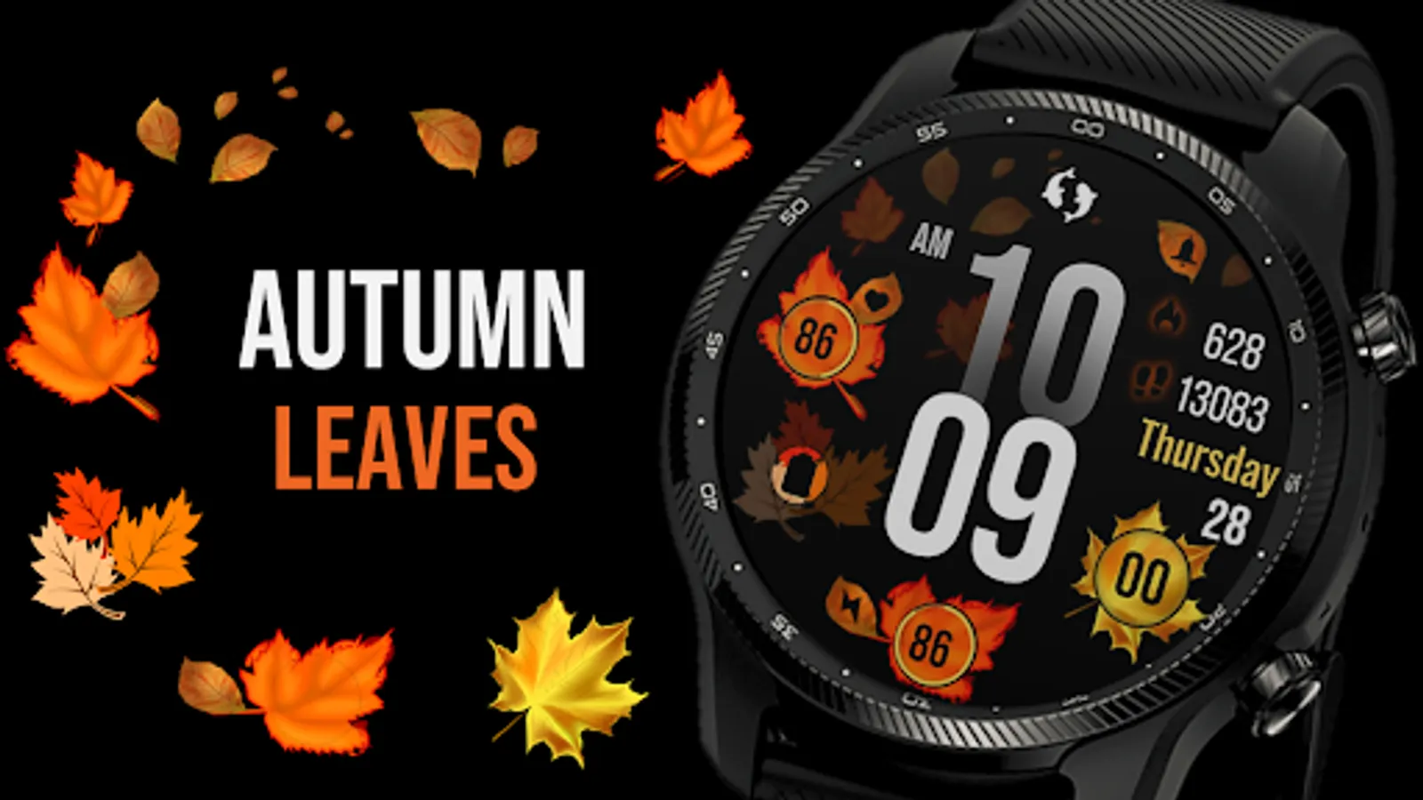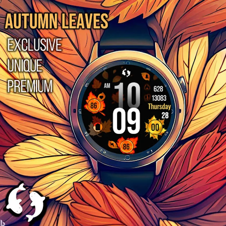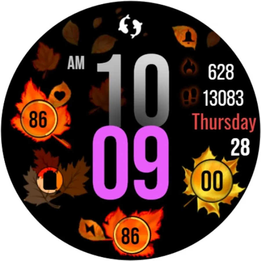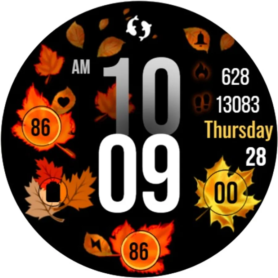 Autumn Leaves - Lyrics Vibes Clock face will bring you perfect atmosphere of Autumn. You can wear this face and Feel Autumn vibes with beautiful Mid-autumn color schemes. It contains 5 background color brightness option and 10+ Minutes & Day in Week Autumn color options.