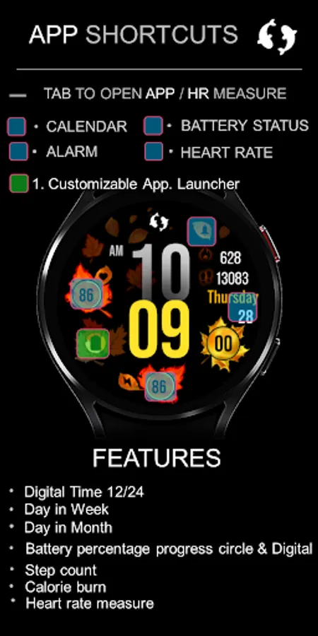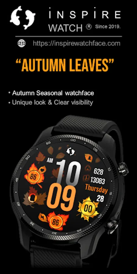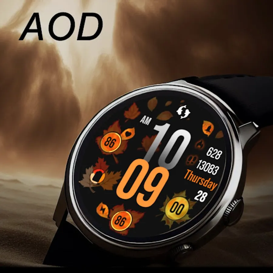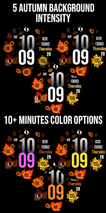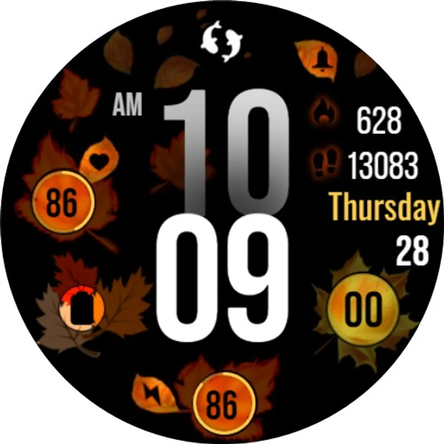 Autumn Leaves - Lyrics Vibes Clock face will bring you perfect atmosphere of Autumn. You can wear this face and Feel Autumn vibes with beautiful Mid-autumn color schemes. It contains 5 background color brightness option and 10+ Minutes & Day in Week Autumn color options.