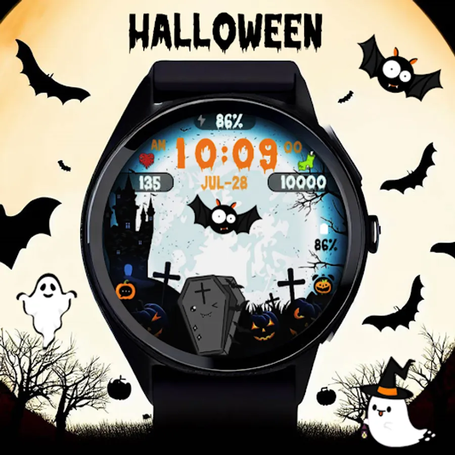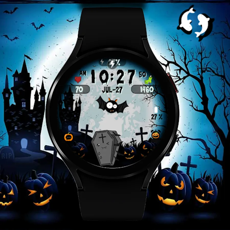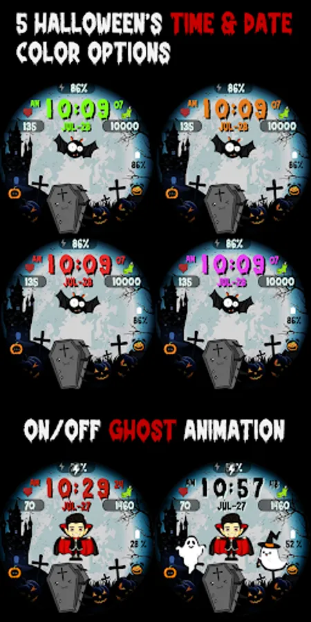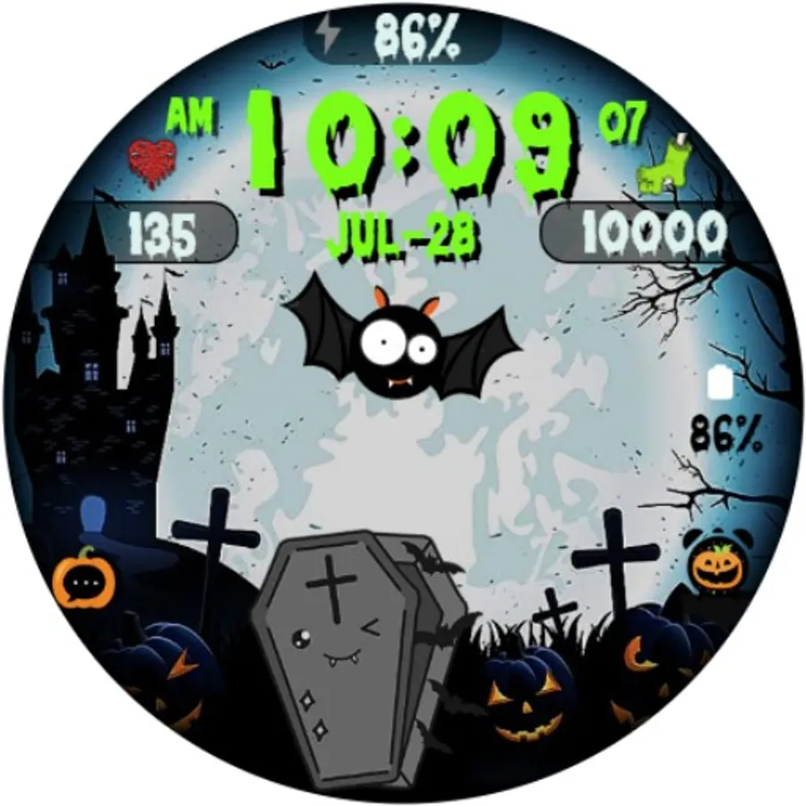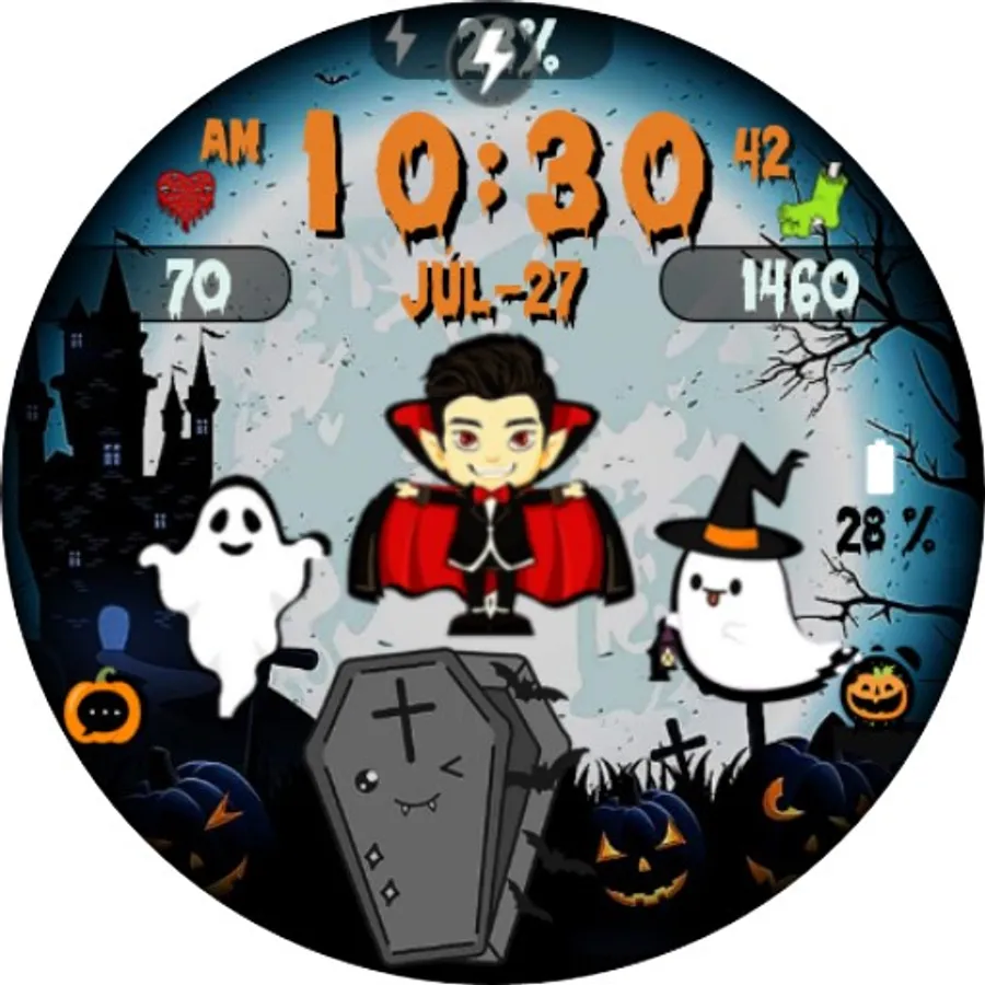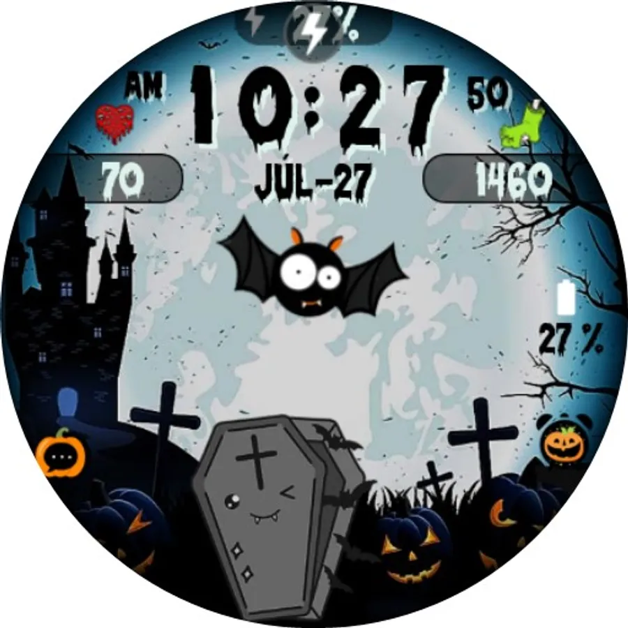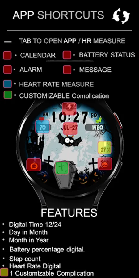 âď¸ On this scary & animated Halloween themed watch-face you will see all important information like Digital time 12-24h time format with bloody Halloweenâs font in option to change 5 different Halloweenâs color palette, Date Info, Steps count - Skeleton/Zombie Leg icon, Heart rate â Scary bloody Heart icon, Alarm icon & messages icons designed as pumpkins all is pasted on scary cemetery background with dark pumpkins.