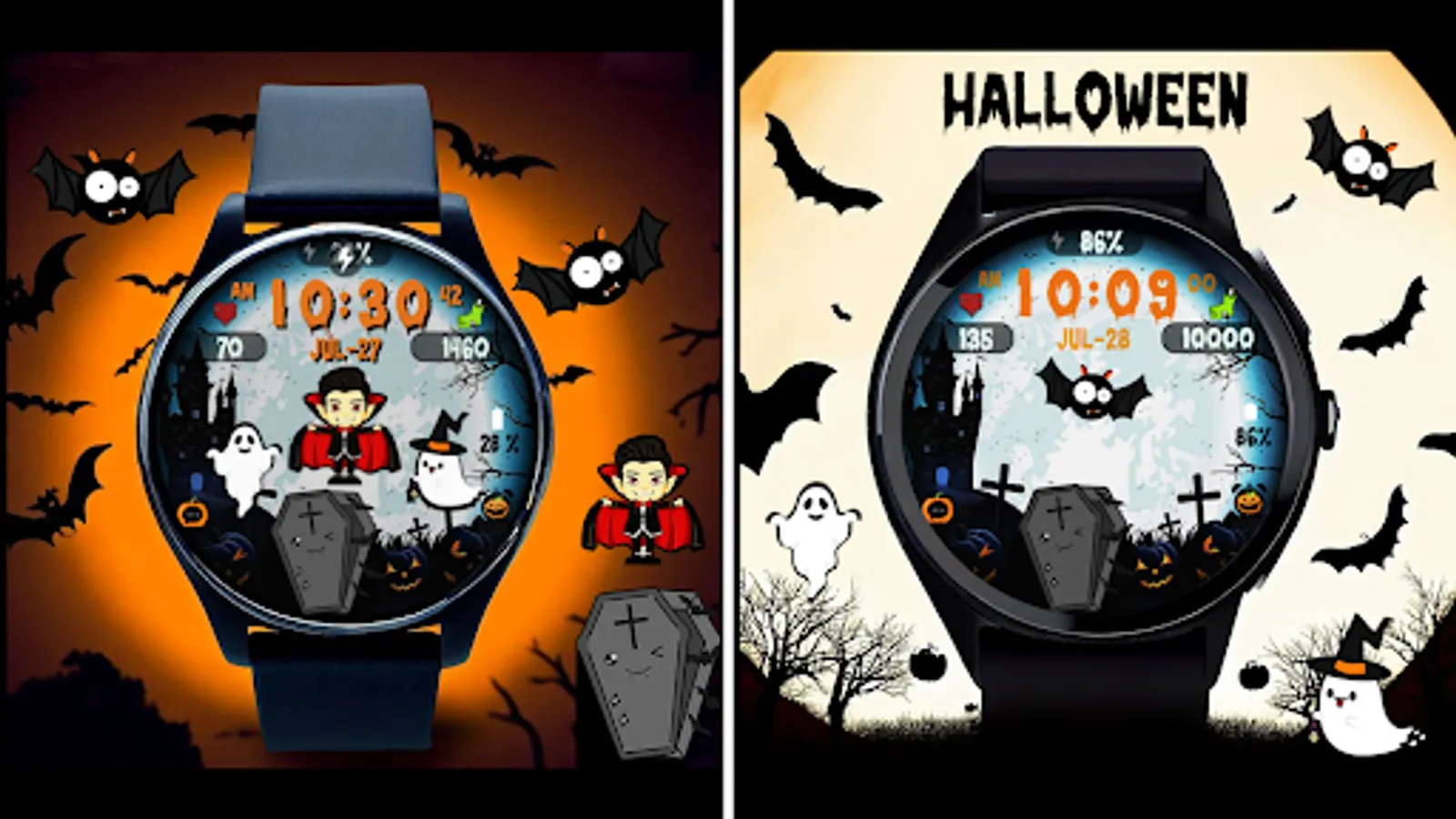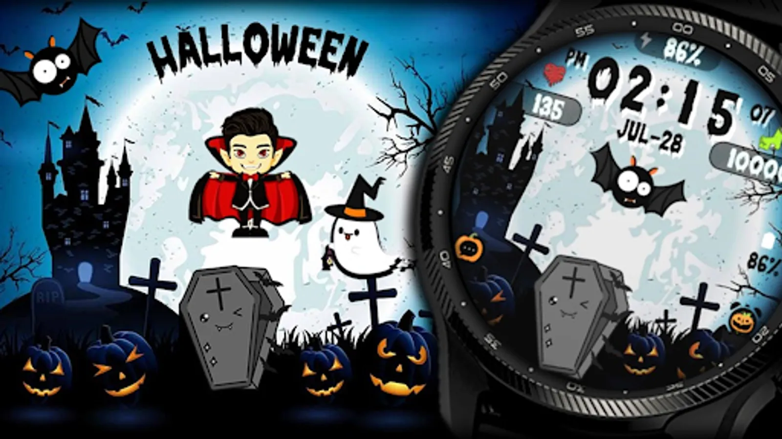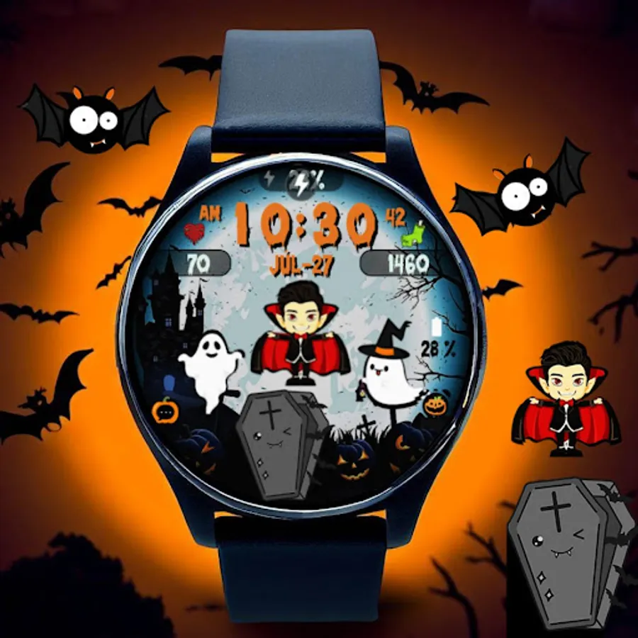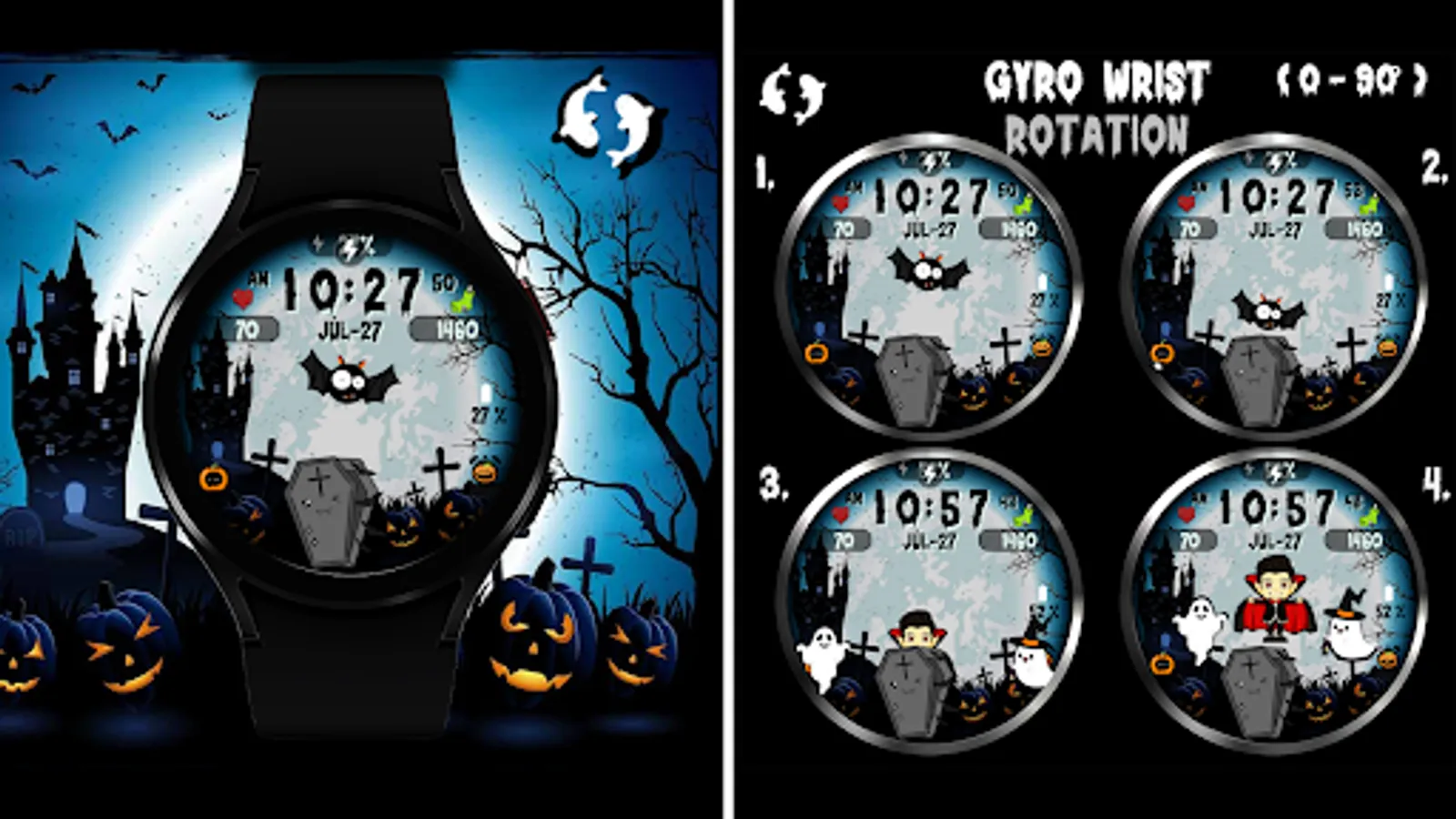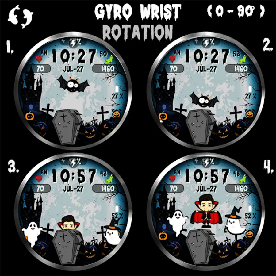 Have a frightening Halloween with our new Clock face. Theme bring you Scary animated effect while you rotate your wrist Bat go to Grave and transform to Vampire/Dracula plus two Ghosts appear from the corners of watch-face with option to turn them on/off.