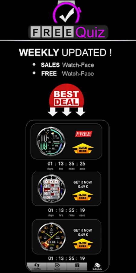 • Sales => Discounted, Free Watch-faces updated on weekly bases.