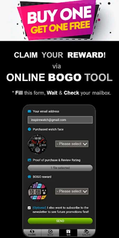 • Fill All Mandatory field on BOGO form Select watchface you purchased, Attach Receipt and Select your Free Reward from the list.