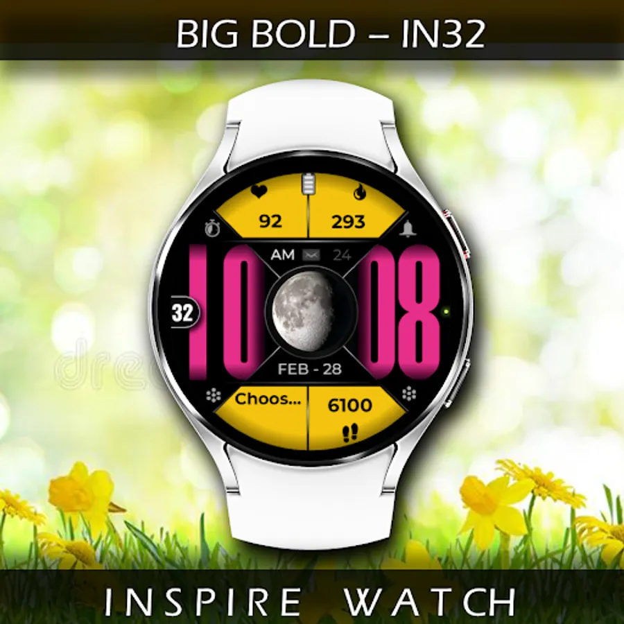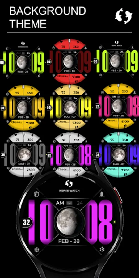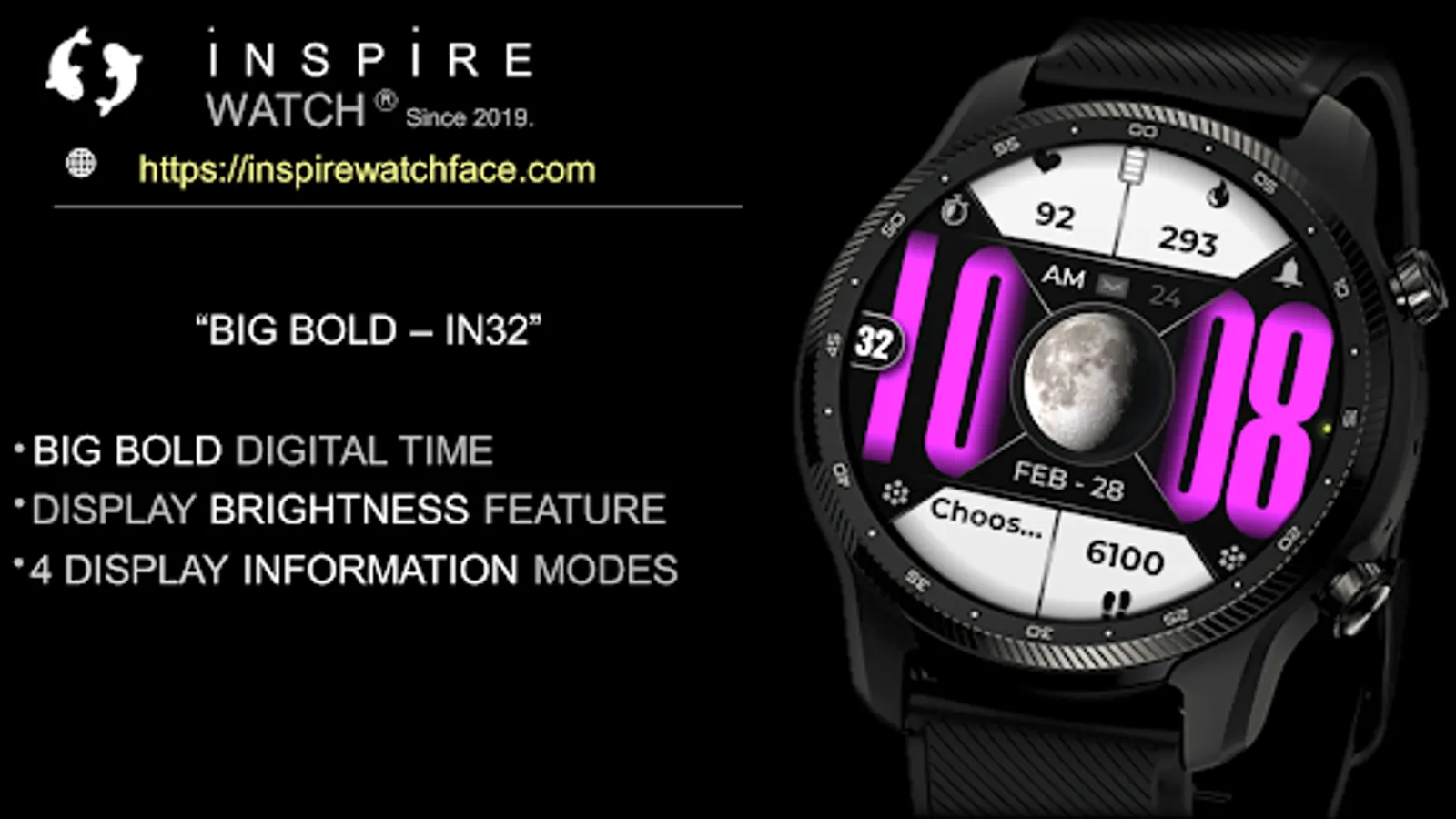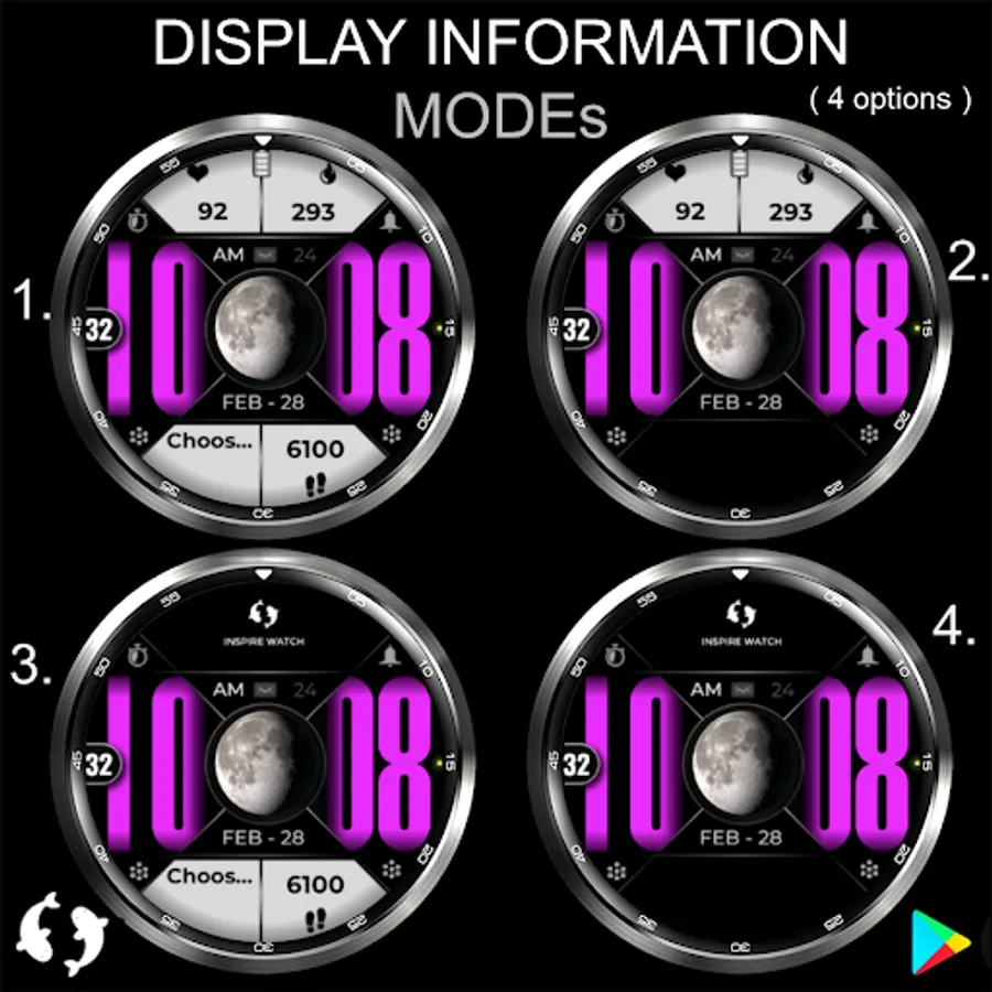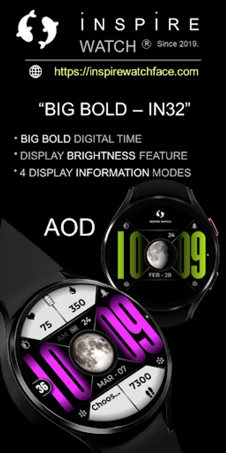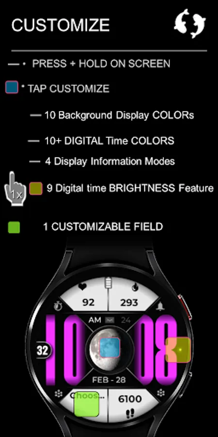 Big Bold Digital Watchface With 4 Display information Modes, Digital time Brightness feature, 10 display background colors and 10 + Digital time color options.