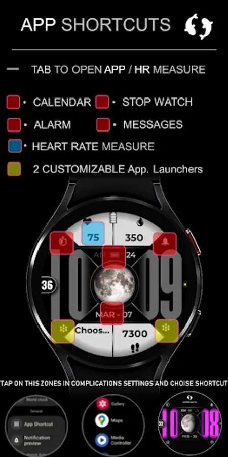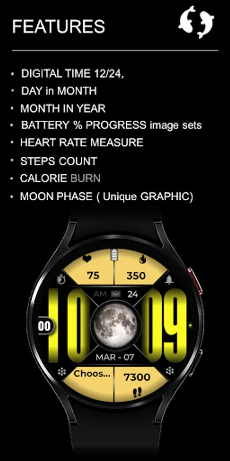 Watchface contain many information as BIG Digital time a Date info, Steps count, Heart rate measure, calorie burn and MOON phase