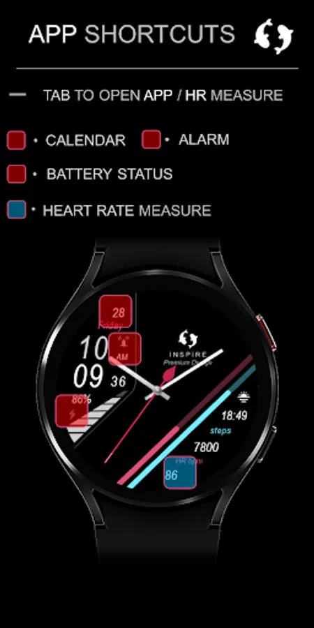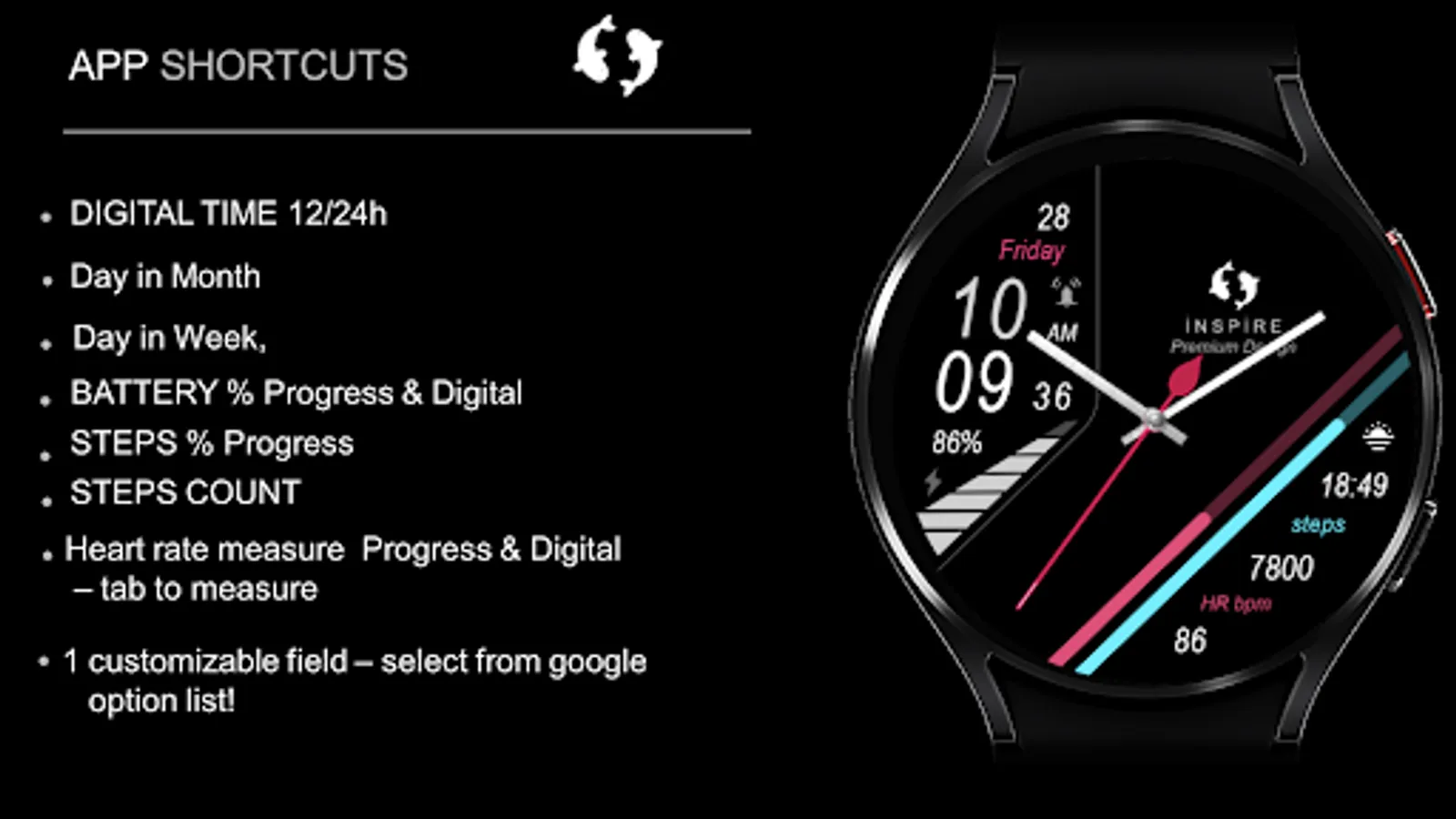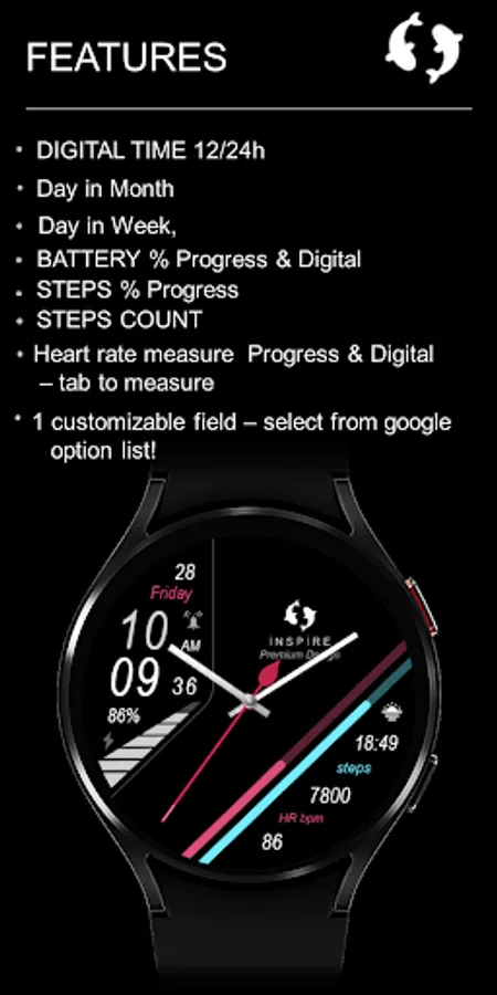 Watch face contain all feature you need for daily use as Analog Time, Digital Time, Day in Week & Day in Month, Battery percentage progress and Digital, Steps percentage progress line, Steps count, Heart rate measure progress and Digital & 1 customizable field, you can choose feature from google option list. Direct application launchers as Alarm, Calendar and Battery status.