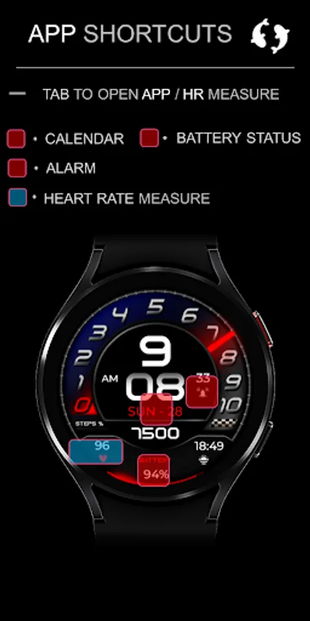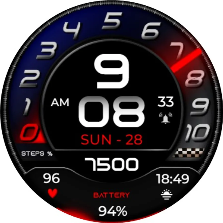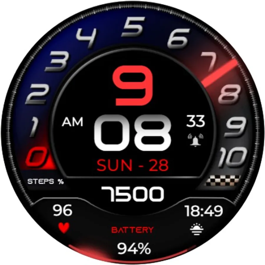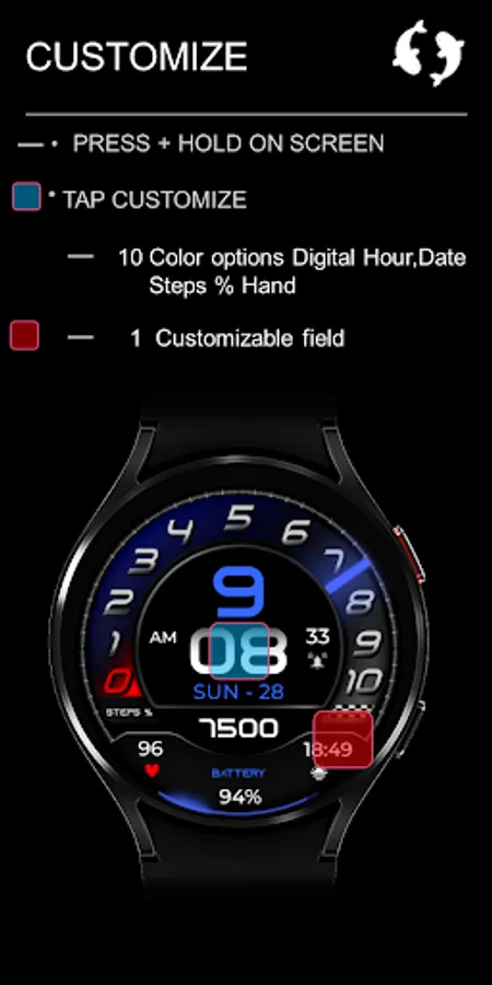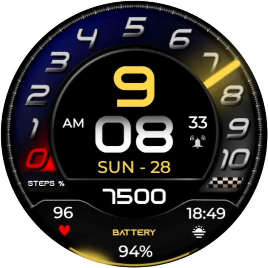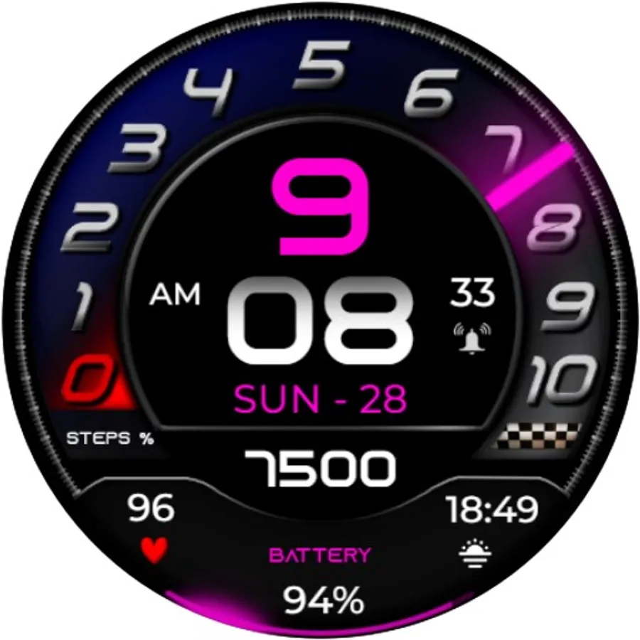 ⌚︎ This beautiful watch-face contain all information you need for daily use Digital time 12/24h format, Date information, Step percentage Dial, Steps count, Heart rate measure, Battery percentage Progress and digital & 1 customizable fields.