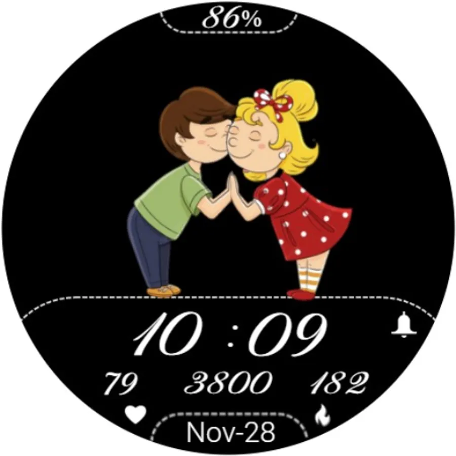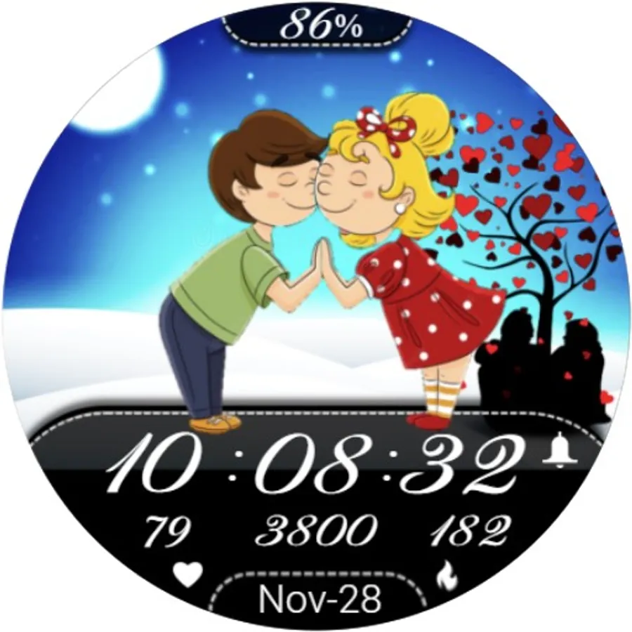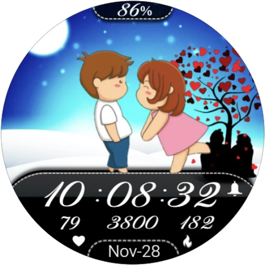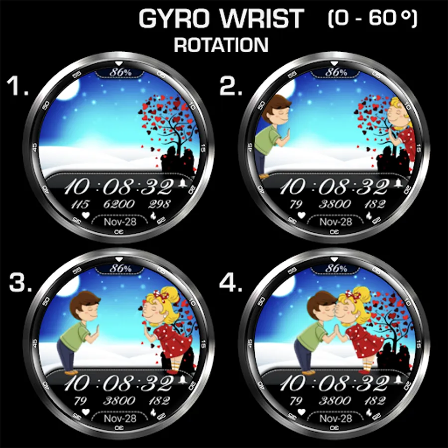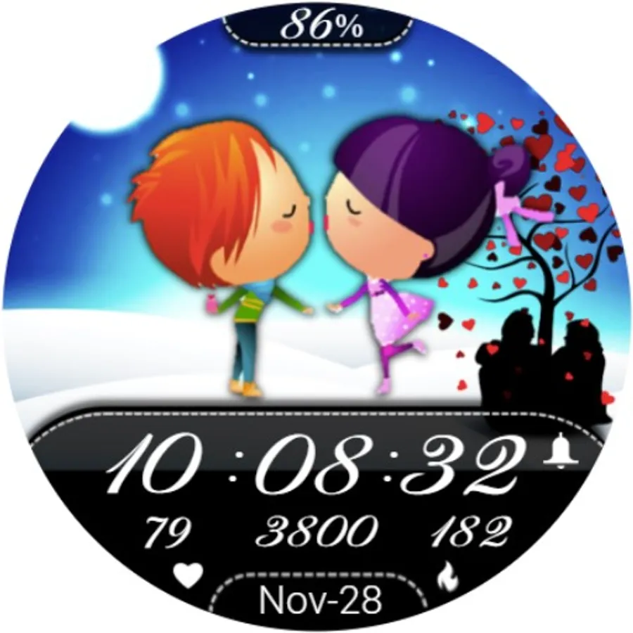 Watch Face for special occasion Valentine's Day for for all "Lovers" Illustrative Style of watchface with 10 Unique Valentine's Theme background and Three different styles of Couples (She-HE) Those people move closer to each other while you rotate your wrist(GYRO FEATURE) Couple have a kiss every time you rotate your wrist from 0 degree to 60 degree.