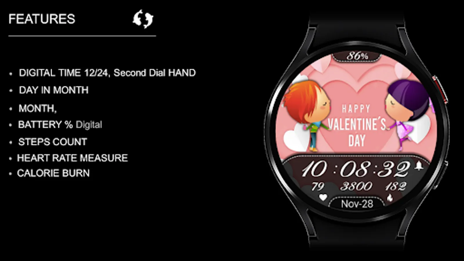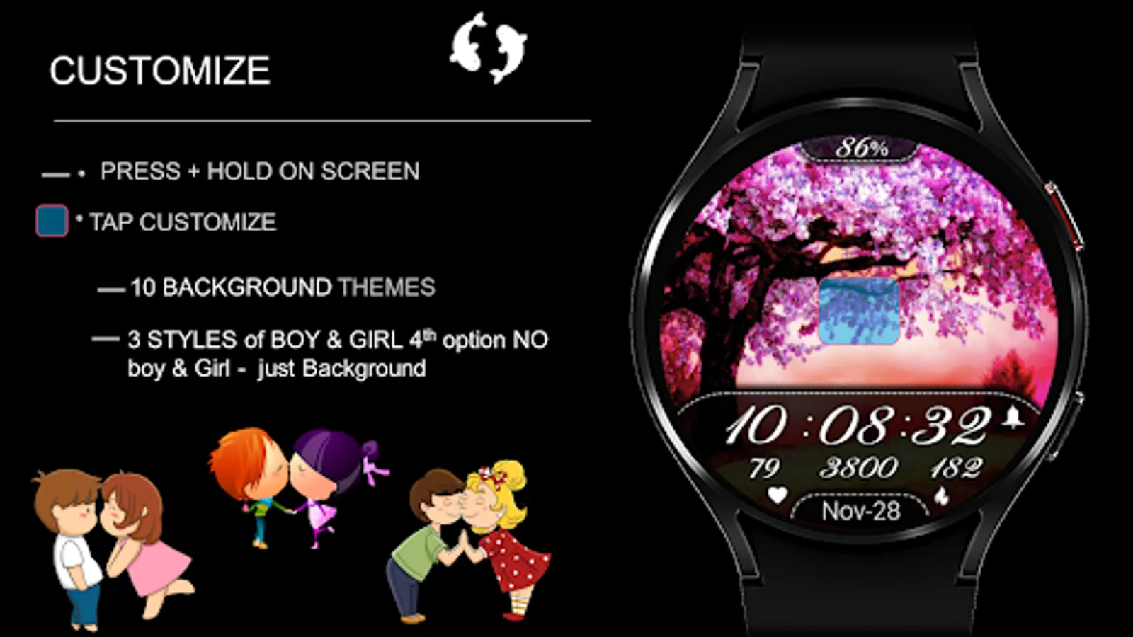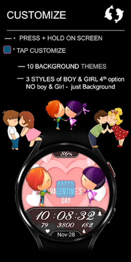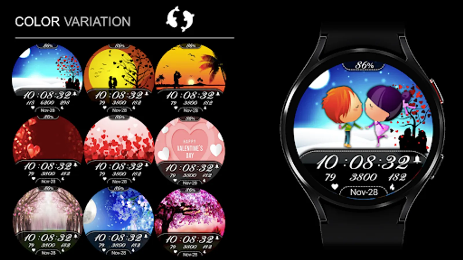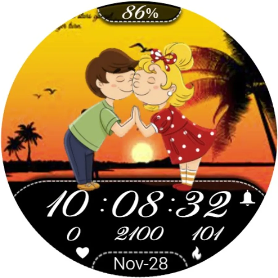 Watch Face for special occasion Valentine's Day for for all "Lovers" Illustrative Style of watchface with 10 Unique Valentine's Theme background and Three different styles of Couples (She-HE) Those people move closer to each other while you rotate your wrist(GYRO FEATURE) Couple have a kiss every time you rotate your wrist from 0 degree to 60 degree.