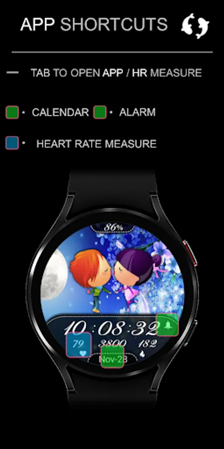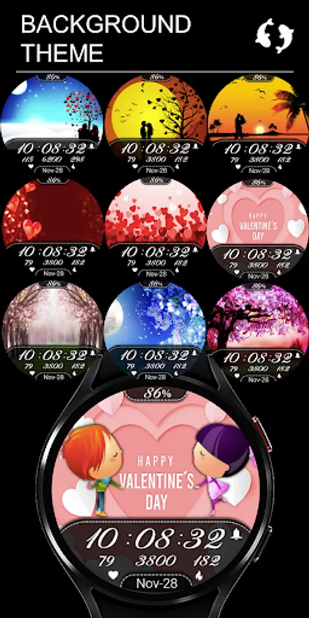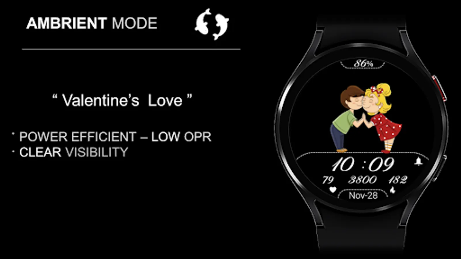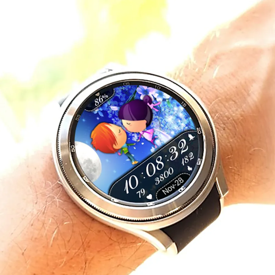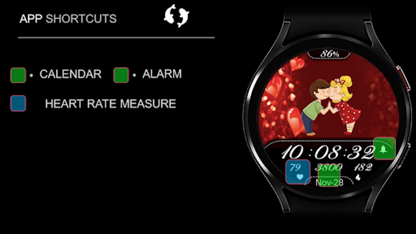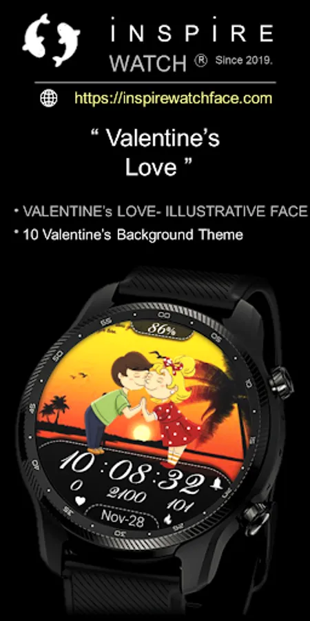 Watch Face for special occasion Valentine's Day for for all "Lovers" Illustrative Style of watchface with 10 Unique Valentine's Theme background and Three different styles of Couples (She-HE) Those people move closer to each other while you rotate your wrist(GYRO FEATURE) Couple have a kiss every time you rotate your wrist from 0 degree to 60 degree.