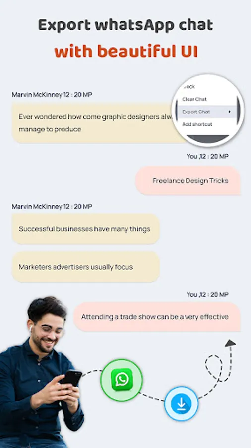 - Export Whatsapp chat in beautiful UI. (Go to Export Chat -> without media -> select this app to restore chat.)