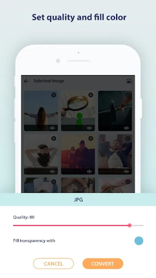 Convert multiple images into jpg, png, webp, gif or pdf. and Fill transparent part with custom color while converting Image to JPG.