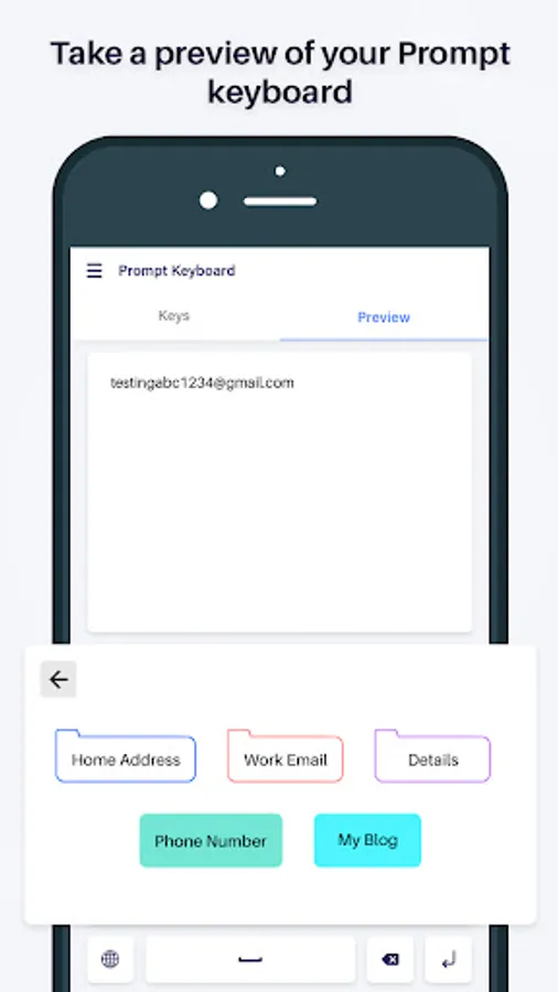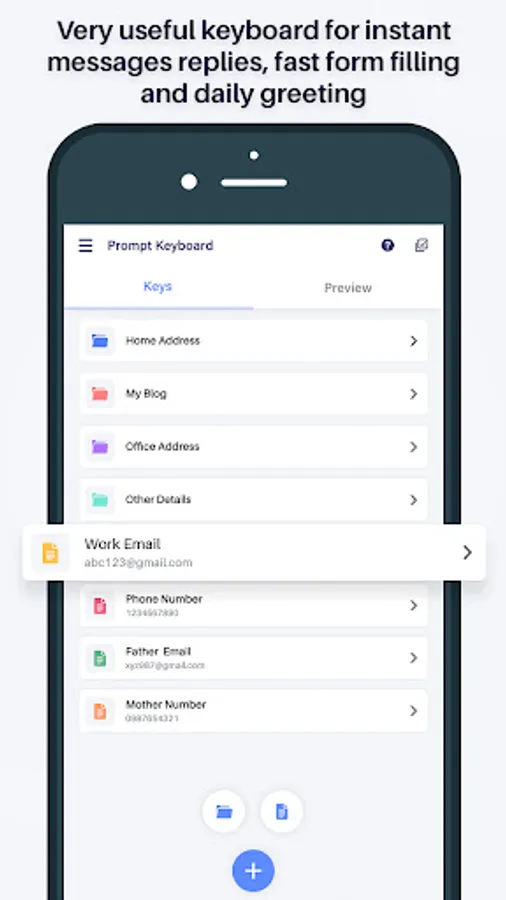 Prompt Keyboard - Instant Keyboard Phrases app very useful to save your phone numbers, email addresses, support replies, fast form completion, addresses, phone numbers, your favorite emoji, or anything you type regularly, and just need one tap when inputting.