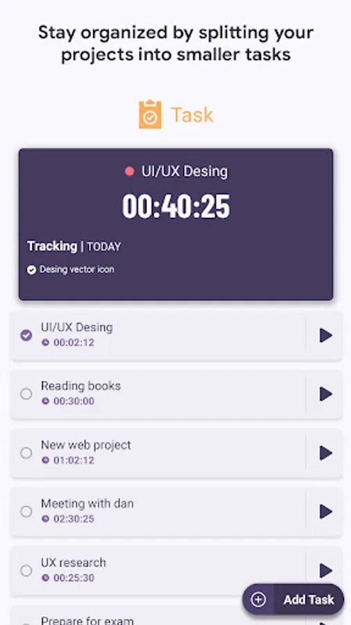 - Time Tracker will start tracking your task immediately and keep the duration until you toggle the task.