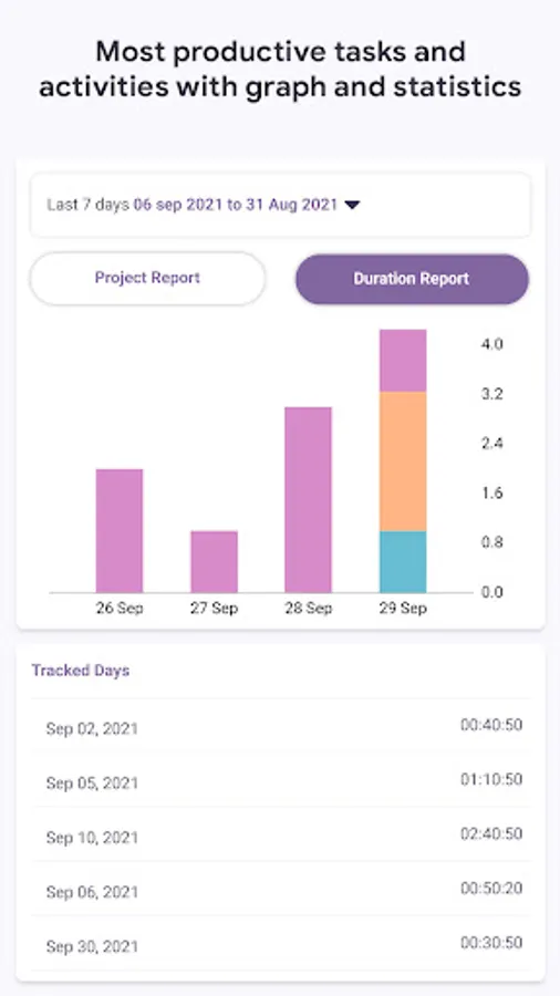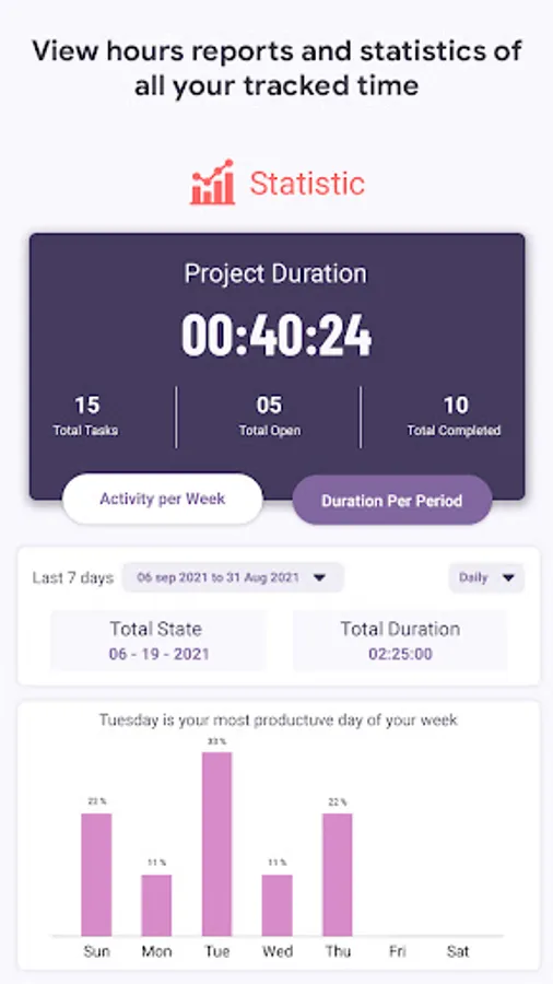 - View most productive tasks and activities with chart and statistics