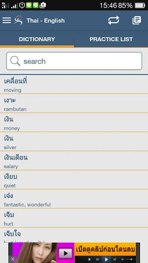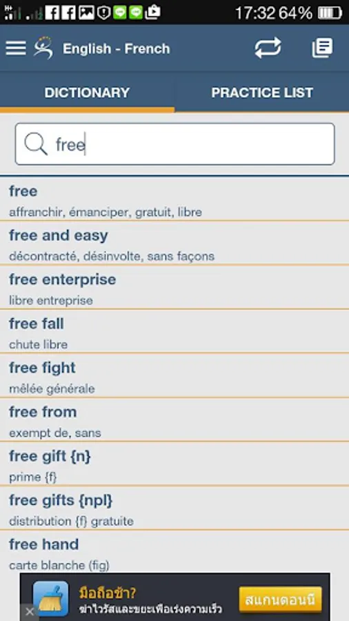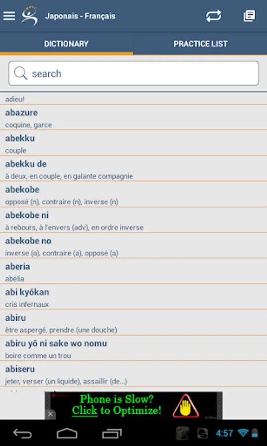 This is the Android version of the free dictionary program that has been available on Freelang's website since 1997. Once you have downloaded the app, you can choose to install as many wordlists as you wish. You can change the direction (i.e. English to French or French to English), look up a word by typing its first letters or simply browse the list. You can also create a practice list and practice your vocabulary.