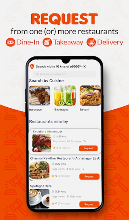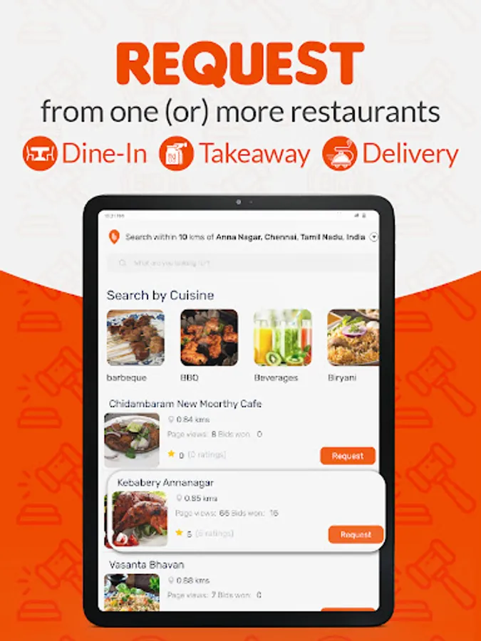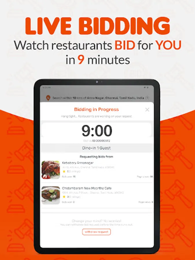 No more scrolling through multiple platforms or making phone calls to get offers and deals. Simply REQUEST restaurants of your choice for discounts and they BID amongst each other to offer you their HIGHEST discount!