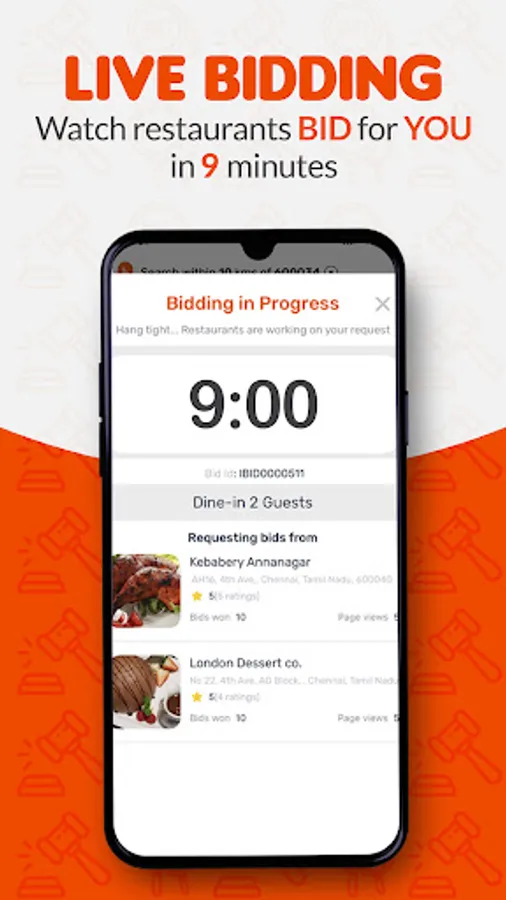 The requested restaurants have 9 MINUTES or less to bid their best discounts and offer you their best deals!