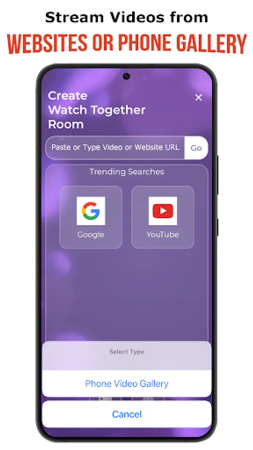 With Watch Together app you can create a watch party room by streaming from any website on the internet, or by streaming direclty from your phone video gallery. Watch with friends your favorite videos, movies, tv shows, live sports and much more.
