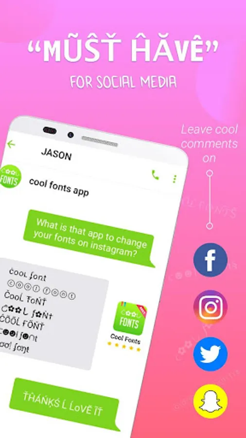 Unique fonts that can be used everywhere you can type a message ( Email,SMS, social networking apps... ) Cool Fonts app does not install fonts in your Android Phone . You can type message in Cool fonts with the selected font and Copy . You can paste copied text in any other apps . Use these fonts in Instagram. Just type message in app & Copy. Then you can open Instagram App and paste it any where you want . Share your great ideas, suggestions to your friends with funny text messages . You can paste it to the bio . Then your bio looks different . Emojicon is different too .