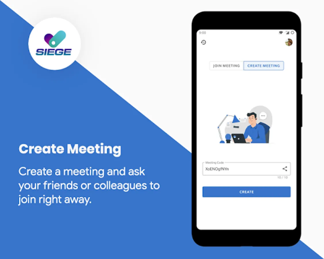 Siege allows upto 70 participants in a single meeting. Create a meeting and invite others to join the meeting by sharing the meeting code right from the app. You can also rejoin previous meetings by browsing the meeting history.