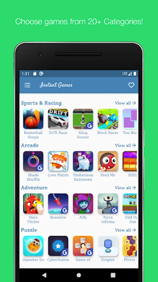 With Instant Games, enjoy 1000+ web games on your Android ranging from Puzzle to Action, Board to Racing, Halloween to Classic and what not!