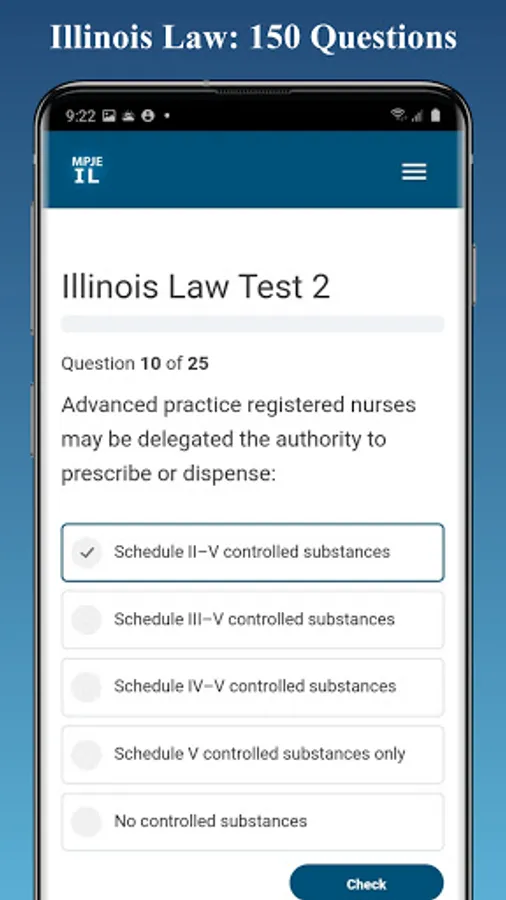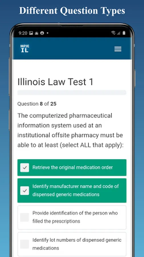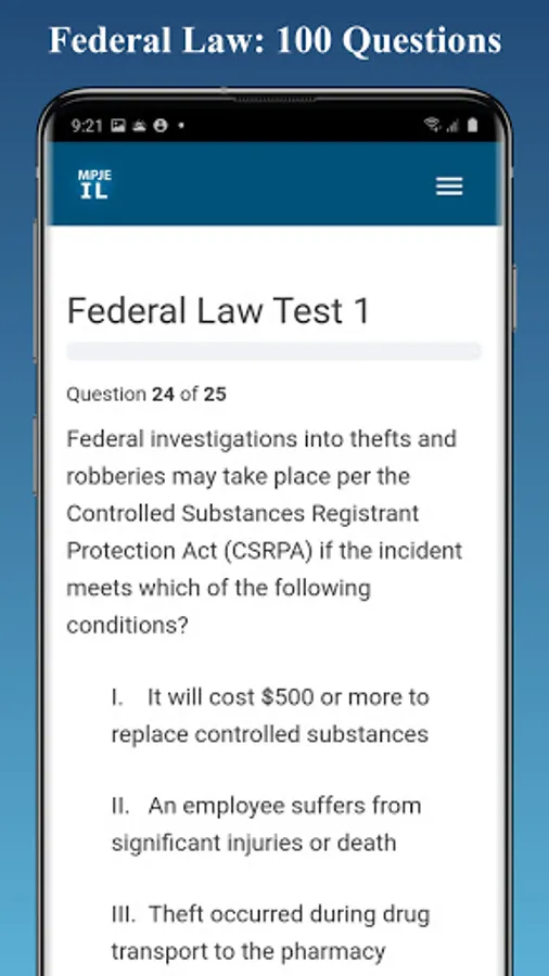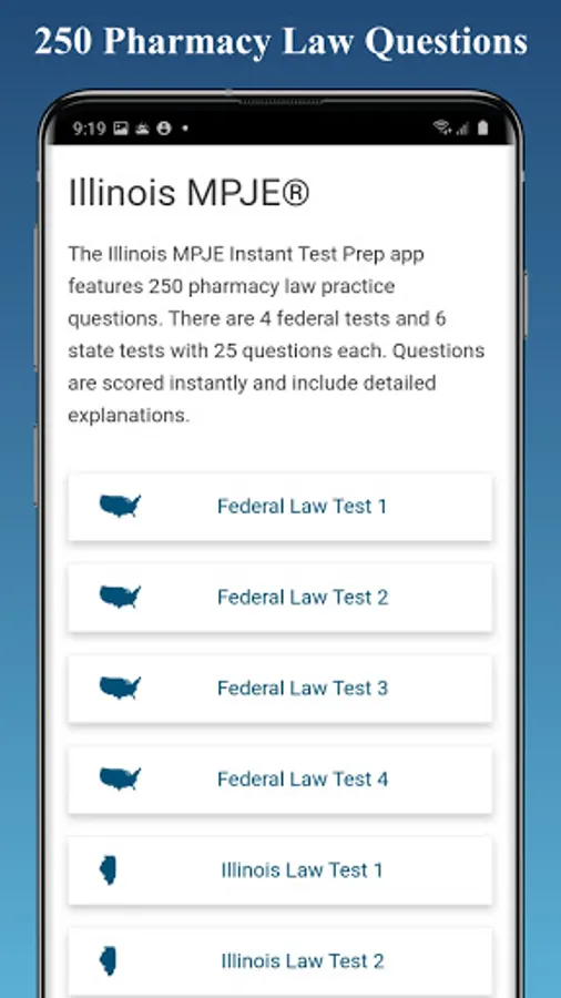 Our Illinois MPJE® Test Prep app includes 250 pharmacy law practice questions. There are 150 Illinois state law questions and 100 federal law questions. Each section is divided into 4 practice tests, with 25 questions per test. Questions are scored instantly and include detailed answer explanations. It covers all of the major topics that are found on the IL Multistate Pharmacy Jurisprudence Examination (MPJE).