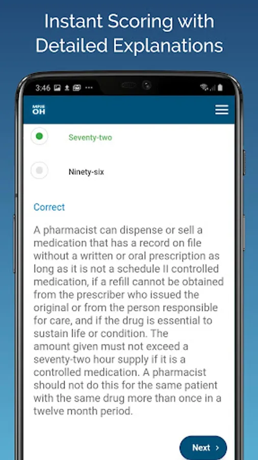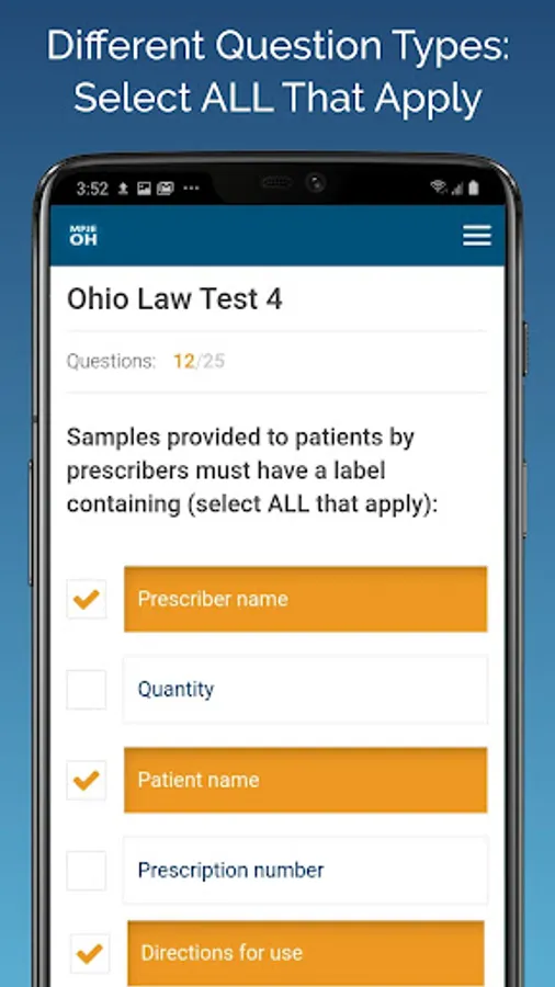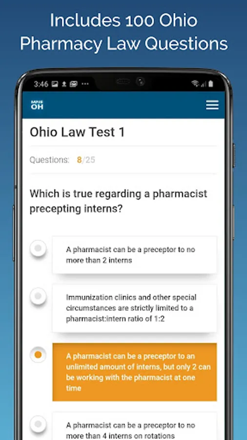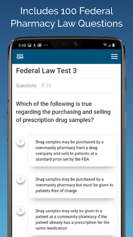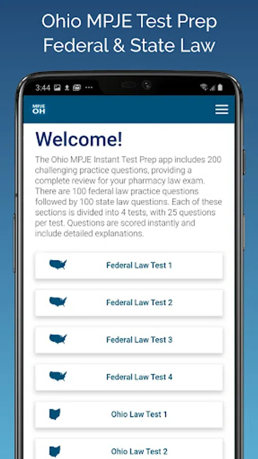 Our Ohio MPJE® Test Prep app includes 200 pharmacy law practice questions. There are 100 Ohio state law questions and 100 federal law questions. Each section is divided into 4 practice tests, with 25 questions per test. Questions are scored instantly and include detailed answer explanations. It covers all of the major topics that are found on the OH Multistate Pharmacy Jurisprudence Examination (MPJE®).