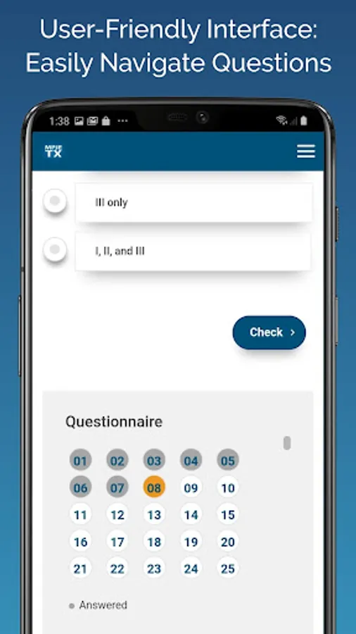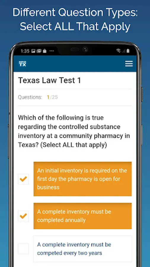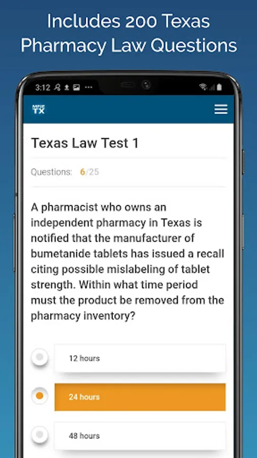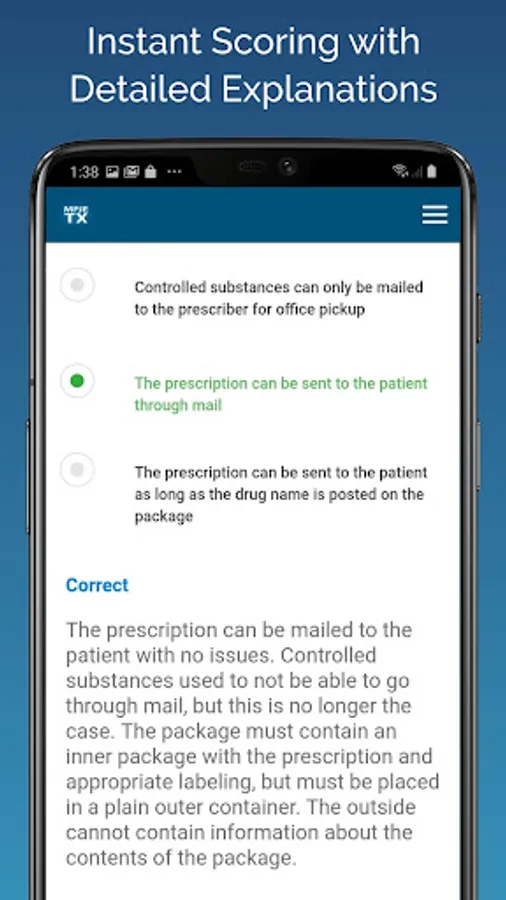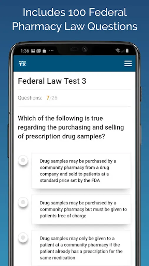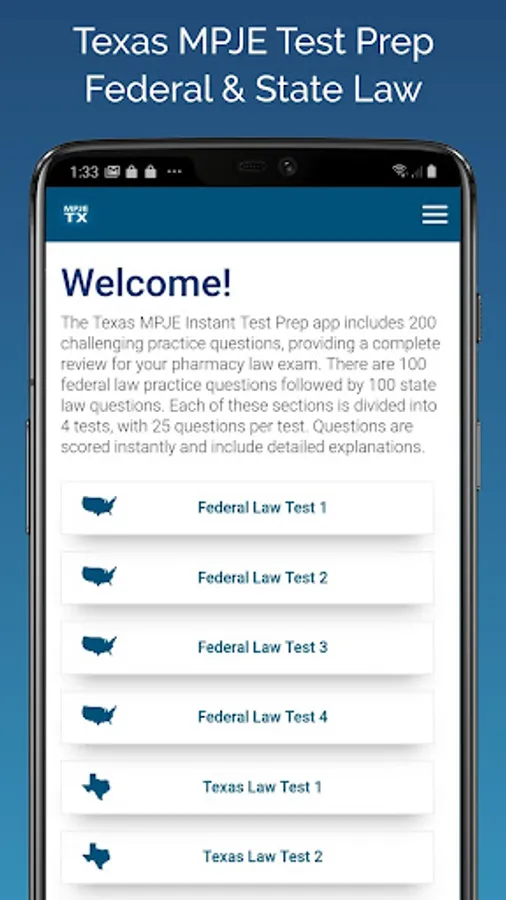 Our Texas MPJE® Test Prep app features 300 pharmacy law practice questions. These consist of 100 Federal questions and 200 Texas state-specific questions. The Federal section has 4 tests with 25 questions per test. The state section has 4 tests with 50 questions per test. Questions are scored instantly, and detailed explanations are provided. The app covers all of the major topics that are found on the TX Multistate Pharmacy Jurisprudence Examination (MPJE).