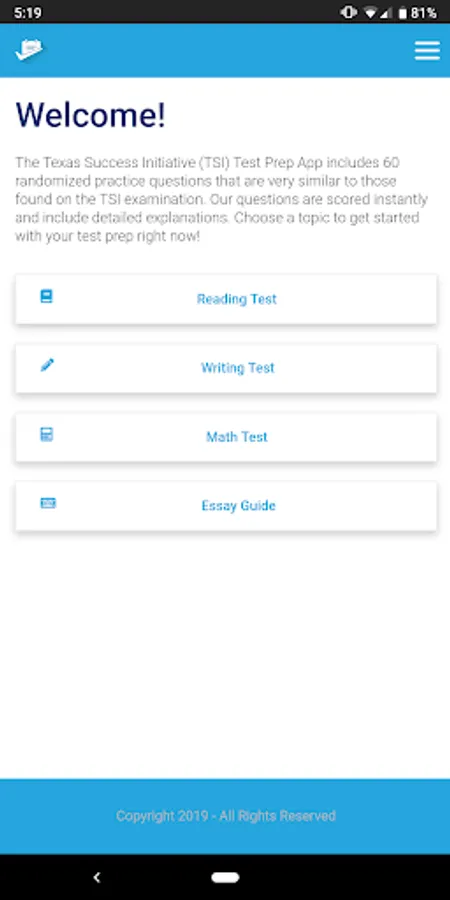 The Texas Success Initiative (TSI®) Test Prep App includes 60 randomized practice questions that are very similar to those found on the TSI® examination. Our questions are scored instantly and include detailed explanations.