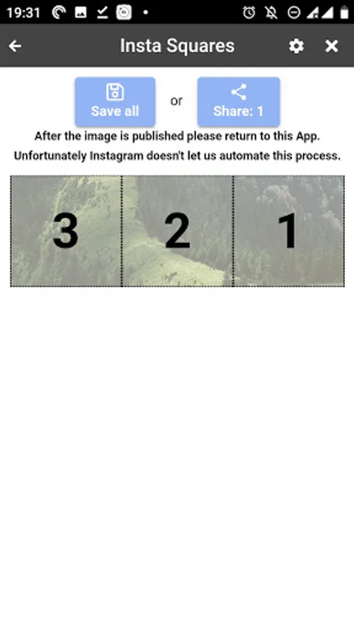 Instant Squares lets you split/splice your pictures into multiple pieces and upload them directly to Instagram to create a big square or a banner/carousel/album and amaze all your Instagram followers.