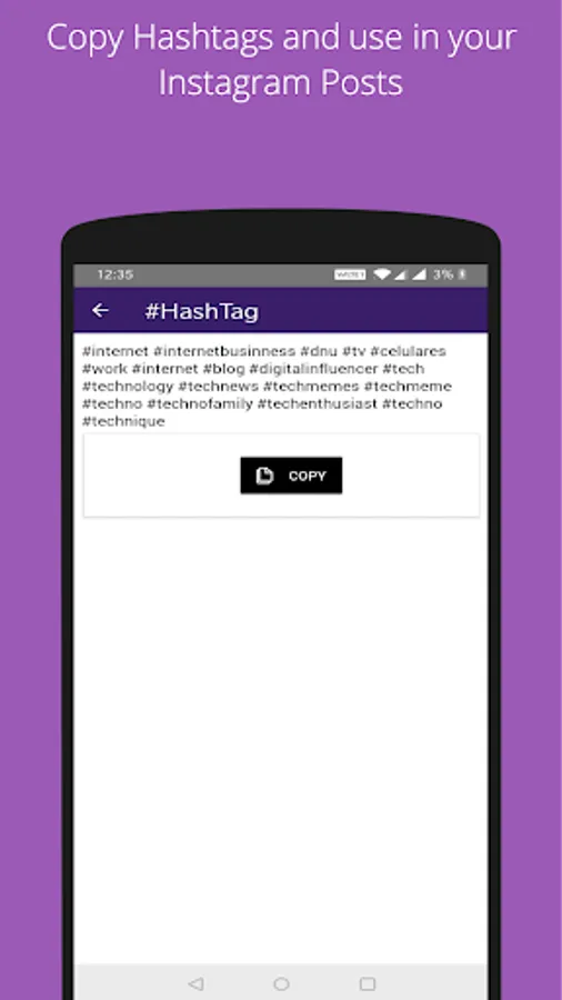 The app doesn't ask to signup and shows no ads. It is really simple and easy to use. Just browse the relevant category to get the popular hastag and use them in your Instagram posts.