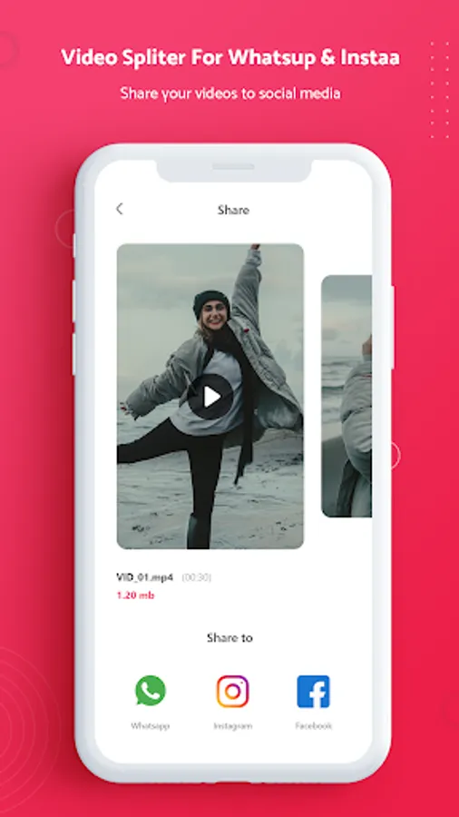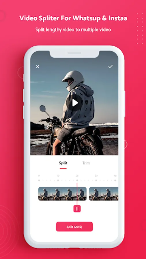 Easily split videos for WhatsApp and Instagram stories to the required length. Split videos and post long videos with one tap and share it to WhatsApp or other social media.