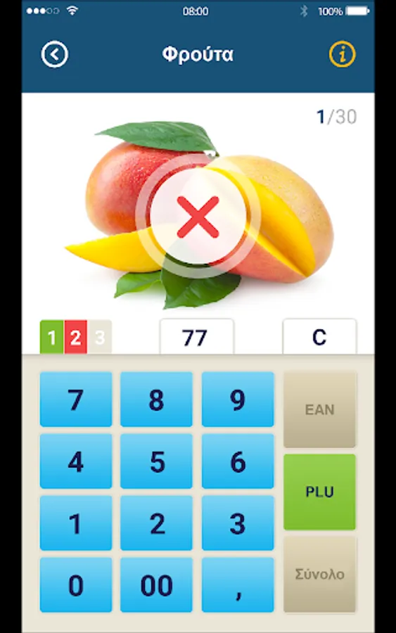 Choosing the function «PLU code" appears the image of a product and six different PLU codes. The aim is to recognize the right product and then choose the correct PLU code.