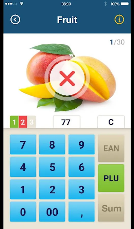 The goal is to enter the correct PLU numbers as quickly as possible for all 30 products.