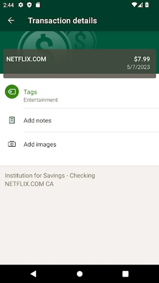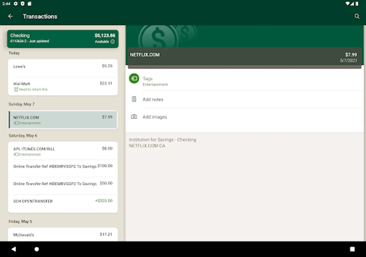 Add Tags, Notes, Images & Geo-Information: By enhancing transactions with custom tags, notes or photos of a receipt or check, you have the ability to stay organized and find exactly what you’re looking for when searching through your finances.