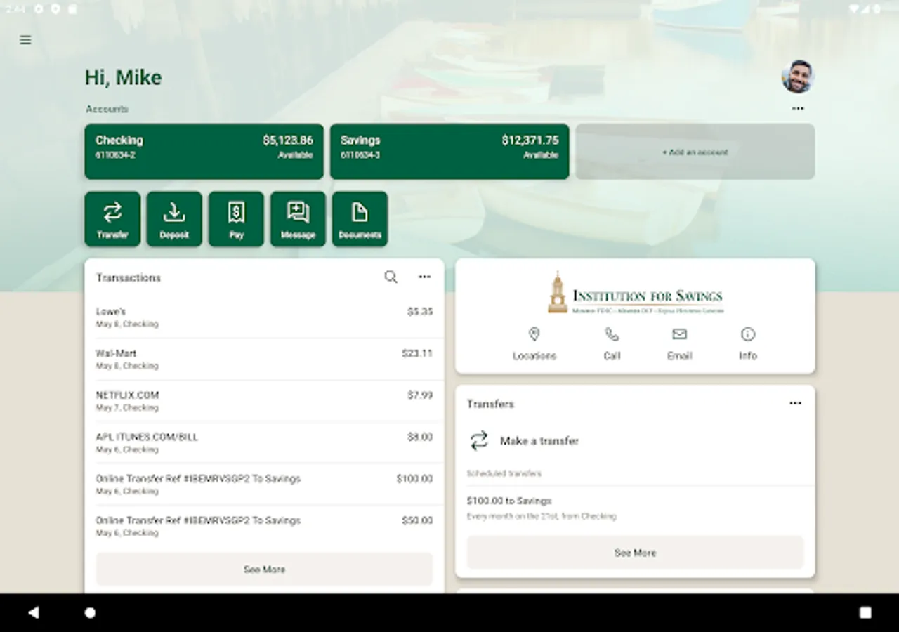 Contact: Locate ATMs or branches and contact Institution For Savings customer service directly from the app.