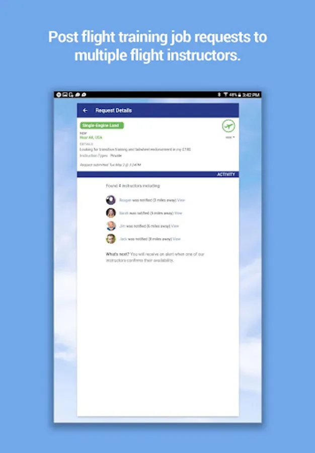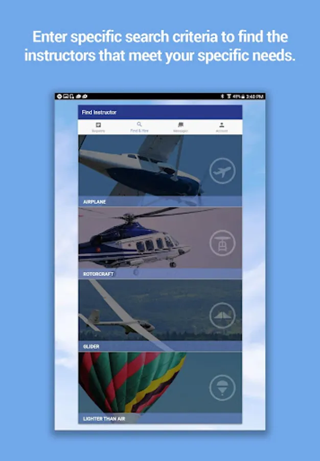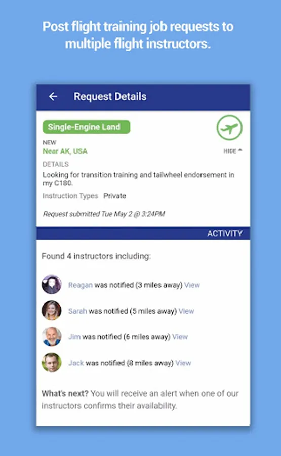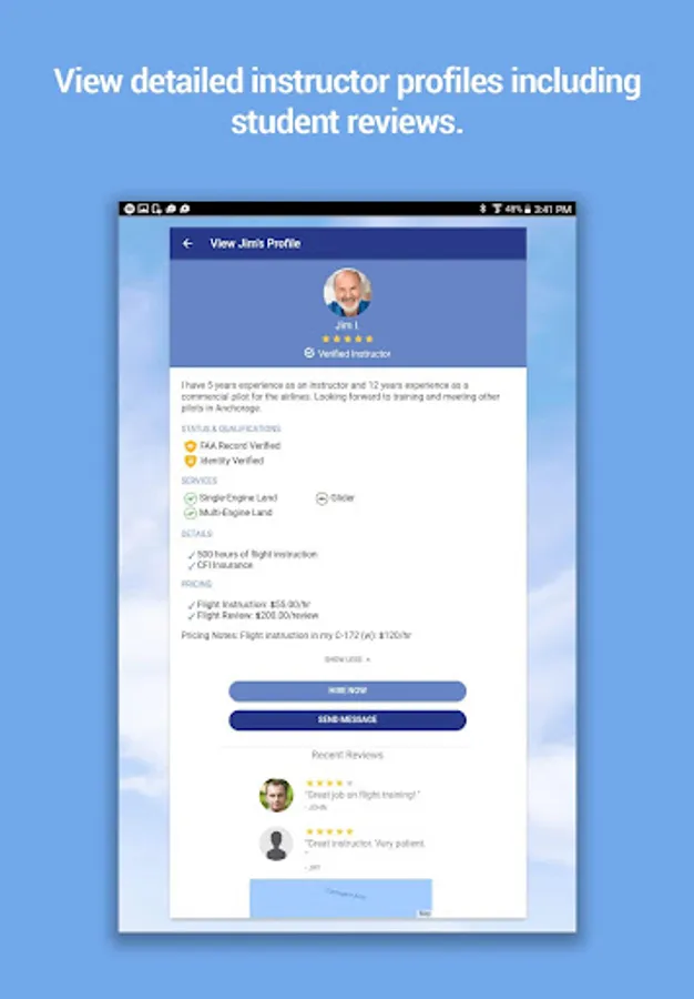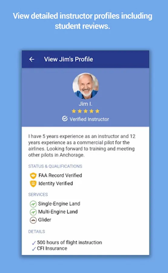 Pilots can search and compare local flight instructors or post their training needs, all for free. All flight instructors are members of the National Association of Flight Instructors, assuring a high level of professionalism and commitment to each pilots unique learning style. Search for your instructor in fixed wing, rotor wing, glider, drone, and lighter-than-air categories; whether seeking initial training, additional ratings, flight review, or something more specific. Review detailed flight instructor profiles and reviews. Easily communicate and book your next lesson. Once your training is complete, send secure payments and leave your own instructor review regarding your experience.