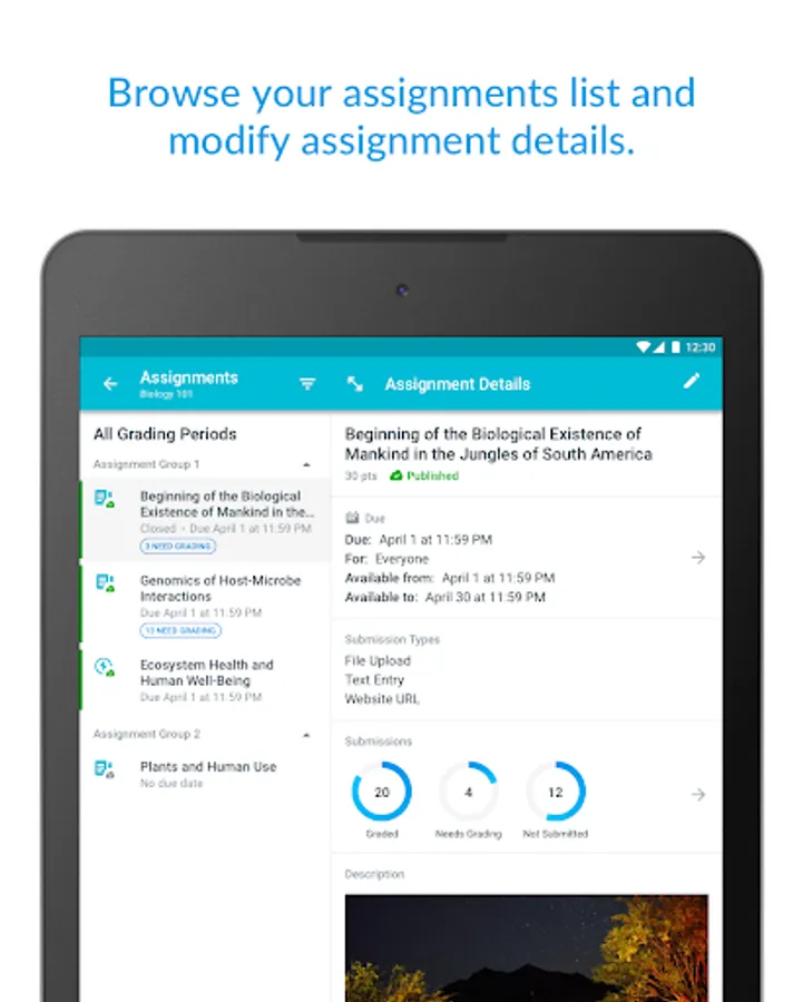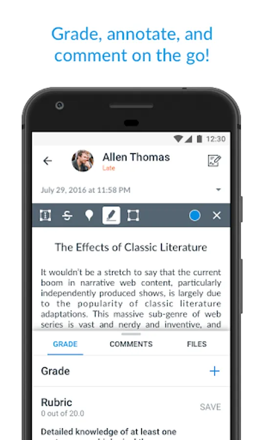 • GRADING: Browse submissions and provide feedback to your students with a new and improved mobile SpeedGrader embedded in this app.