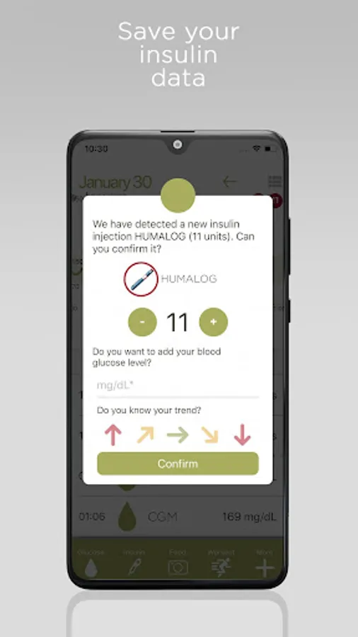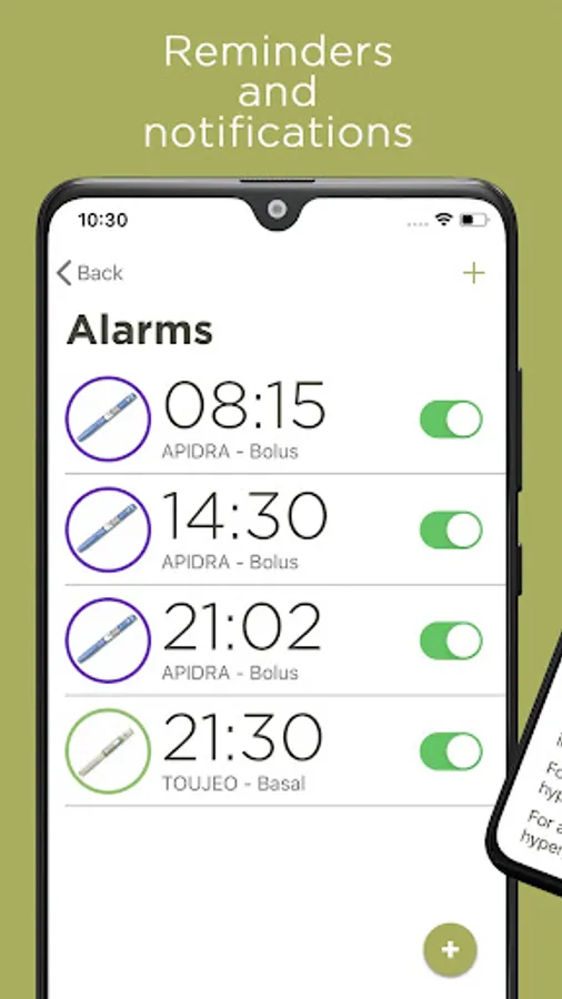 ALARMS AND REMINDERS! Set reminders to take your insulin, to check your sugar levels after rapid-acting insulin doses, and much more.*Available devices for insulin doses automatic saving: