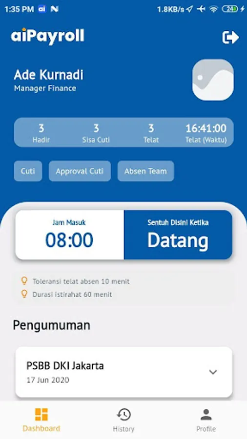 Aplikasi payroll PTInsura Media Solusi untuk mengajukan cuti dan melihat payroll.
