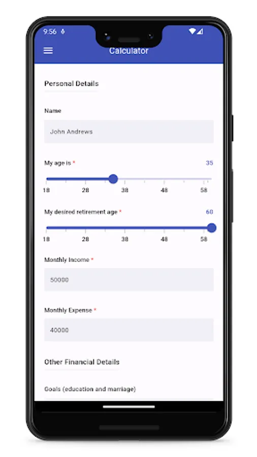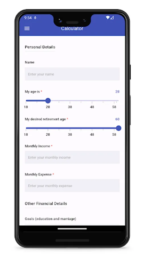 In the term insurance calculator app, you can input your details like name, age, retirement age, income, expenses, etc. to find your accurate coverage amount for a term insurance plan. It also considers some additional information about expenses for children (education and marriage) in the future, Liabilities such as a home loan, a retirement corpus for your spouse, and savings from your current wealth.