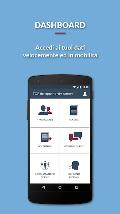 The mobile app Top srl allows agents and subagents of the group to have a more operational tool for mobility and connected with the agency, find customers around you and work with them by sending messages or documents.