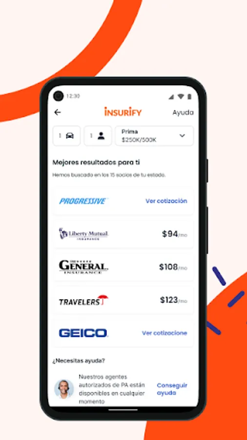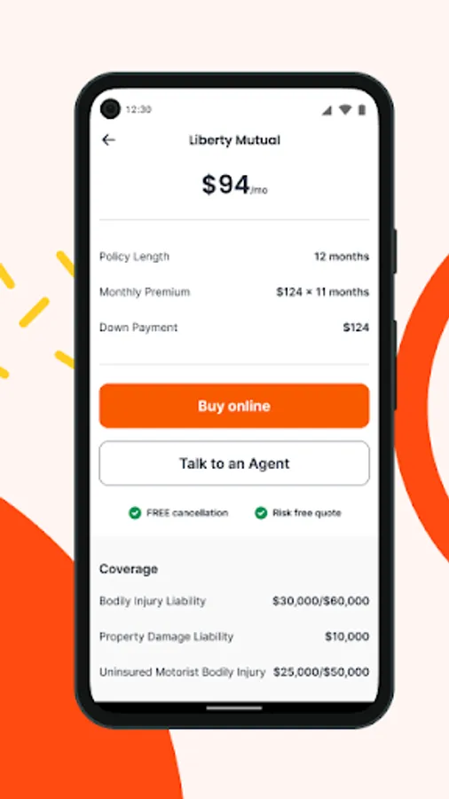 Just download the app, complete a short form, and choose from a list of customized car insurance quotes from up to 20 different providers. You’ll be able to set your desired coverage limits to meet or exceed your state’s minimum insurance requirements, compare available deals, and secure coverage all within the app. Complete your shopping experience 100% in-app or get help from one of our licensed insurance agents over the phone.