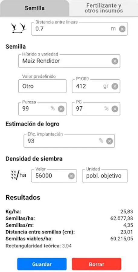 It has an input calculator that allows determining the quantity of product in bulk or in containers necessary for planting and fertilizing a given surface.