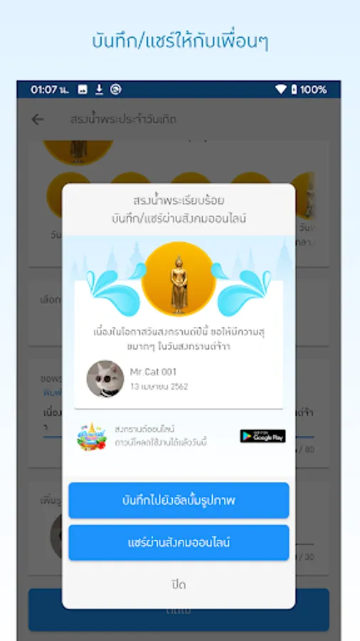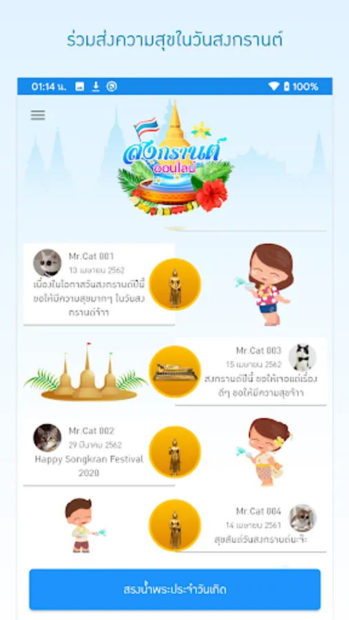 Songkran Festival this year, where to go to bathe? Probably a headache question If you don't know where to go Come here "Songkran Online" bathing the Buddha amulet online Bathing the Buddha amulet of the birthday And can also add a wish or a blessing request as well Can be fully organized and then pour water online New style that has never been seen before And can also be saved to the device Or share pictures Songkran online to friends through many online communities. Songkran Online Also comes with a courtyard Which is the perfect corner to sit and watch the greeting Bathing the Buddha amulet online From friends to enjoy once. Meet the Songkran Quotes. Happy Songkran greetings from friends around the world. That together share via the system Our Songkran Online Do not wait. Hurry and download to go to bathe the Buddha image online. Together today Like, give a rating Songkran Online Our