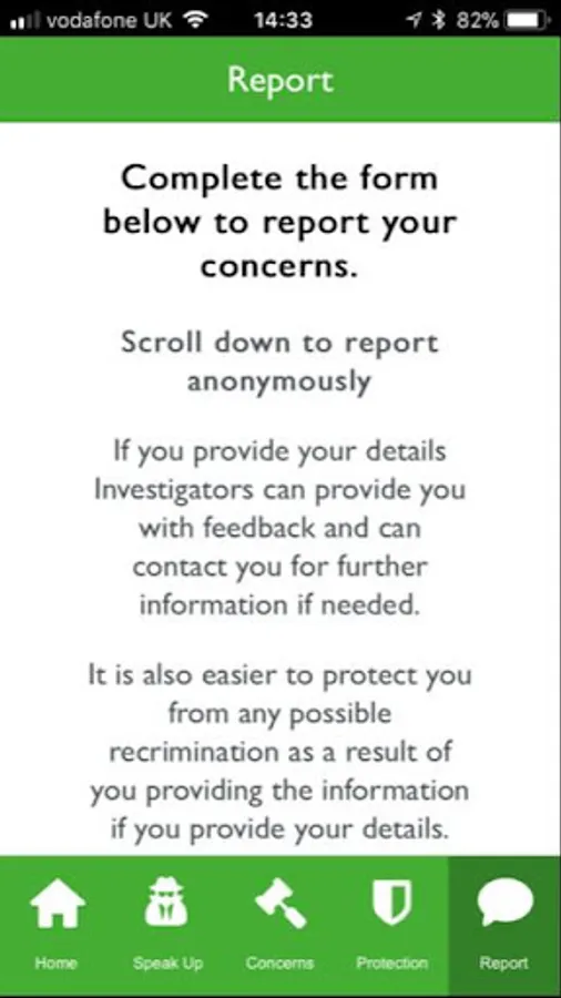 You are encouraged to raise reports internally with your direct line manager. If, for whatever reason you are unable to do so, you can raise a concern through this app. Please note that failure to provide your contact details may make it more difficult to investigate your concern or provide you with appropriate feedback.