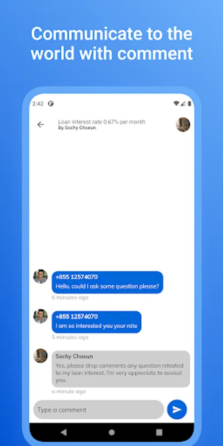 Once users are interested in any interest rate, they can communicate with the post owner and also other users by using the comment feature. This is very helpful for credit officers (CO) and users who are looking for a loan offer from another bank, microfinance or business.